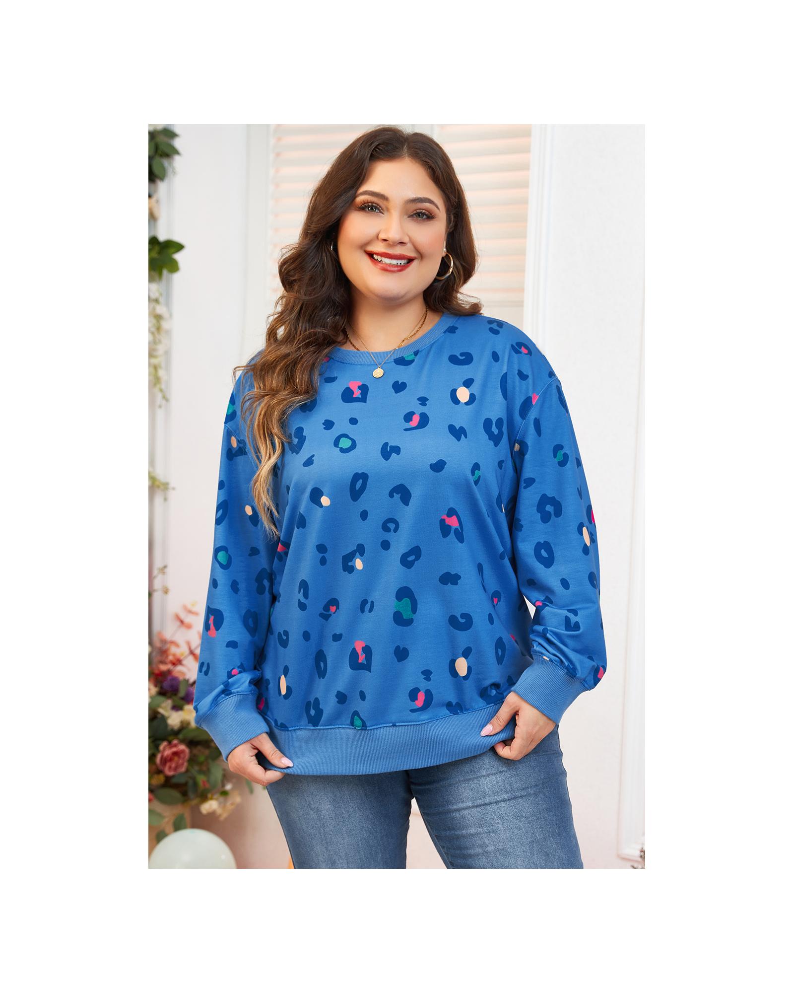Sky Blue Leopard Ribbed Edge Drop Shoulder Pullover Sweatshirt – 3X