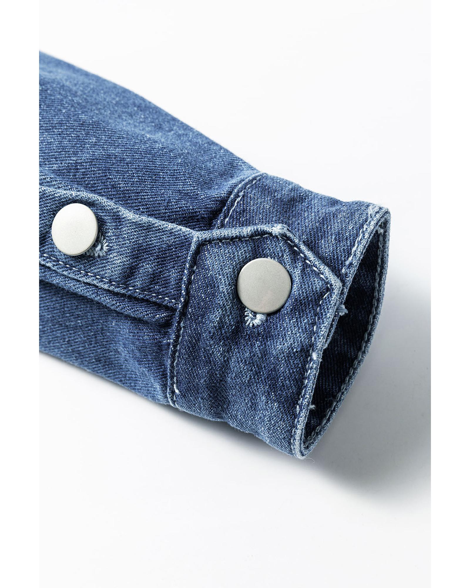 This long denim jacket features a trendy fitted design with a light sky blue wash, distressed details, and frayed accents. Its longline length offers a slender silhouette, making it a versatile piece for layering over casual outfits.