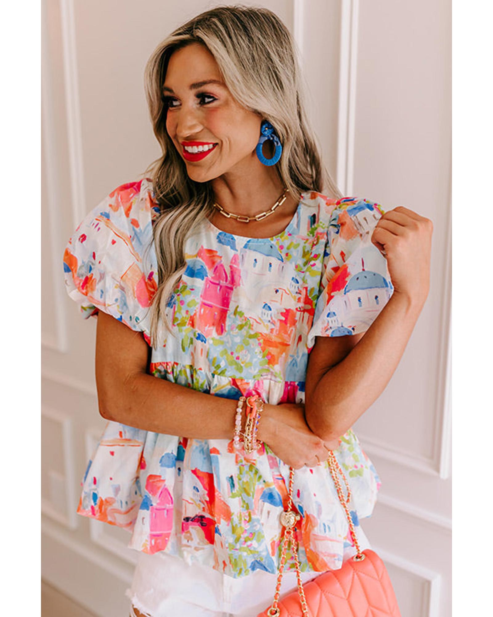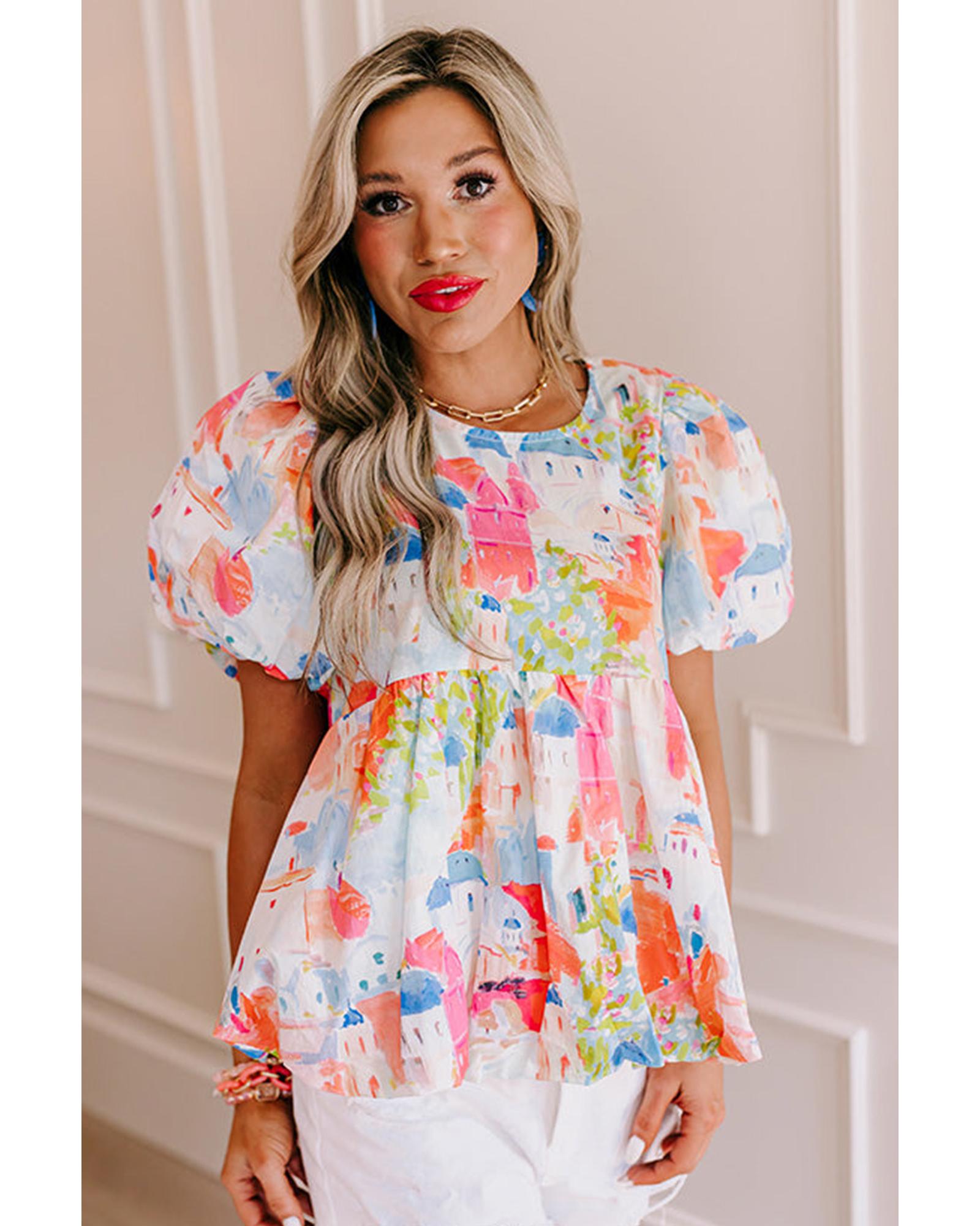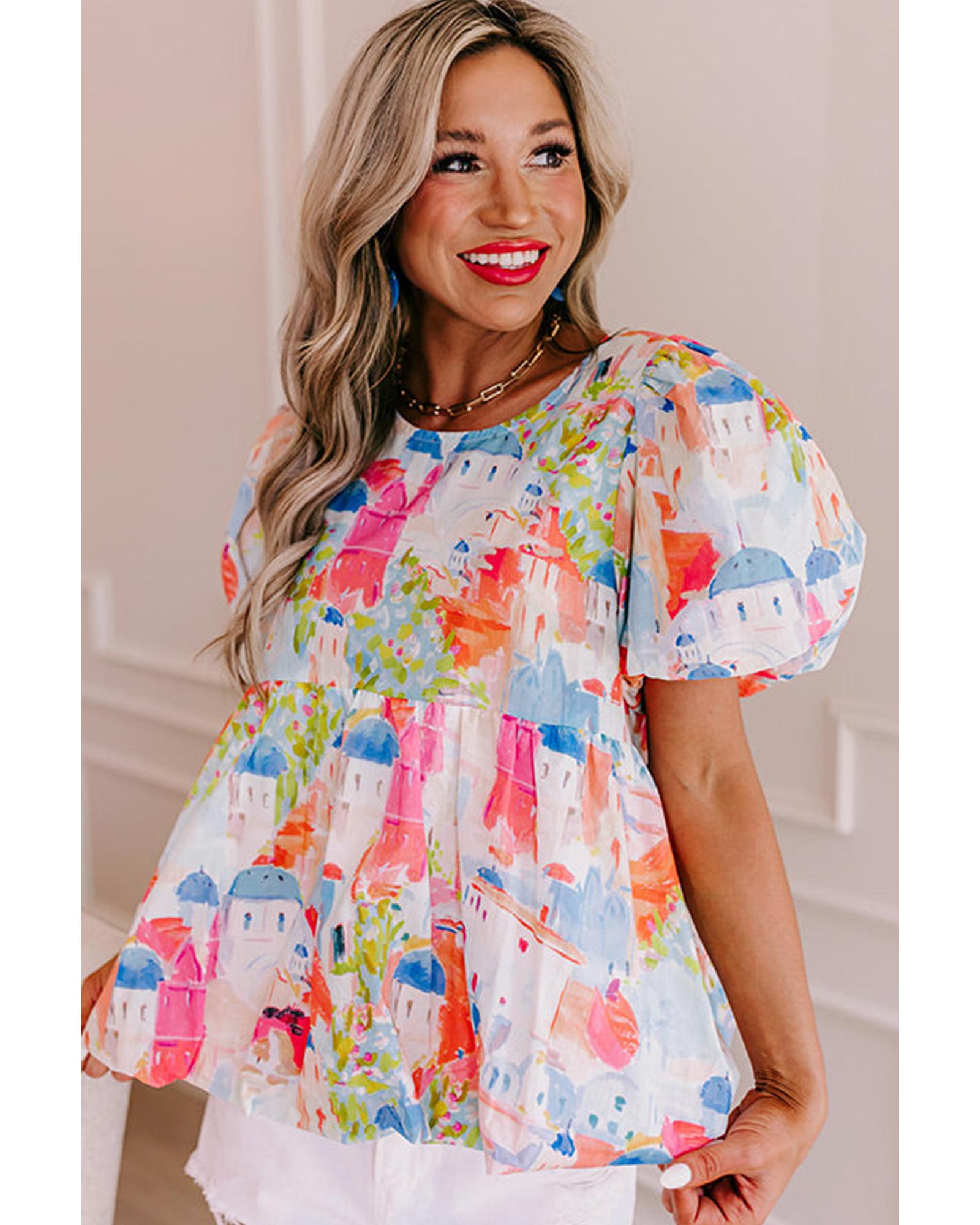 This Sky Blue Babydoll Top features a colorful abstract cityscape pattern, offering a trendy and relaxed silhouette. Designed with a lightweight material, it combines comfort with a stylish look, making it suitable for various casual occasions.