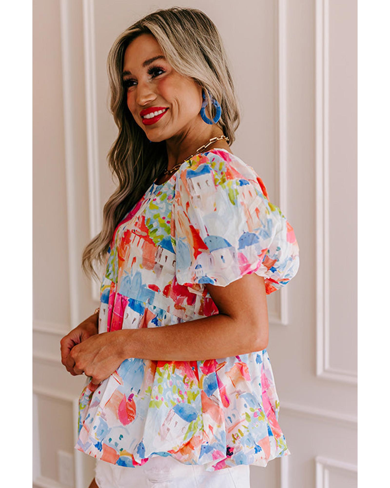 This stylish babydoll top features a colorful abstract cityscape pattern, offering a trendy and relaxed silhouette. Made from lightweight material, it provides comfort and a flattering fit suitable for various occasions. The design includes puff sleeves with elastic bands, a crew neckline with a back button closure and keyhole detail, and a ruffled round hemline, making it a versatile addition to your wardrobe.