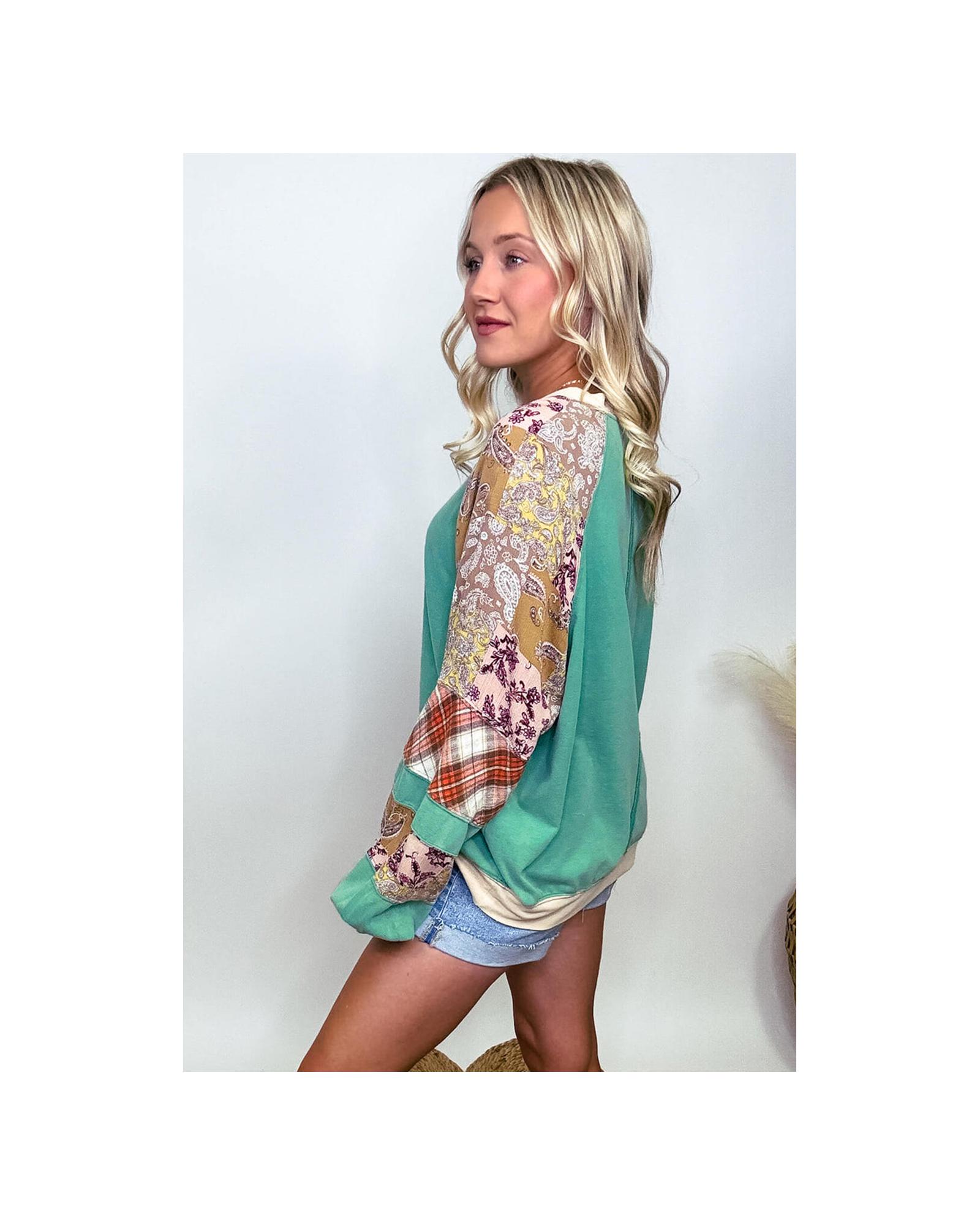 Sky Blue Plus Size Plaid Floral Patchwork Raglan Sleeve Sweatshirt – 3X