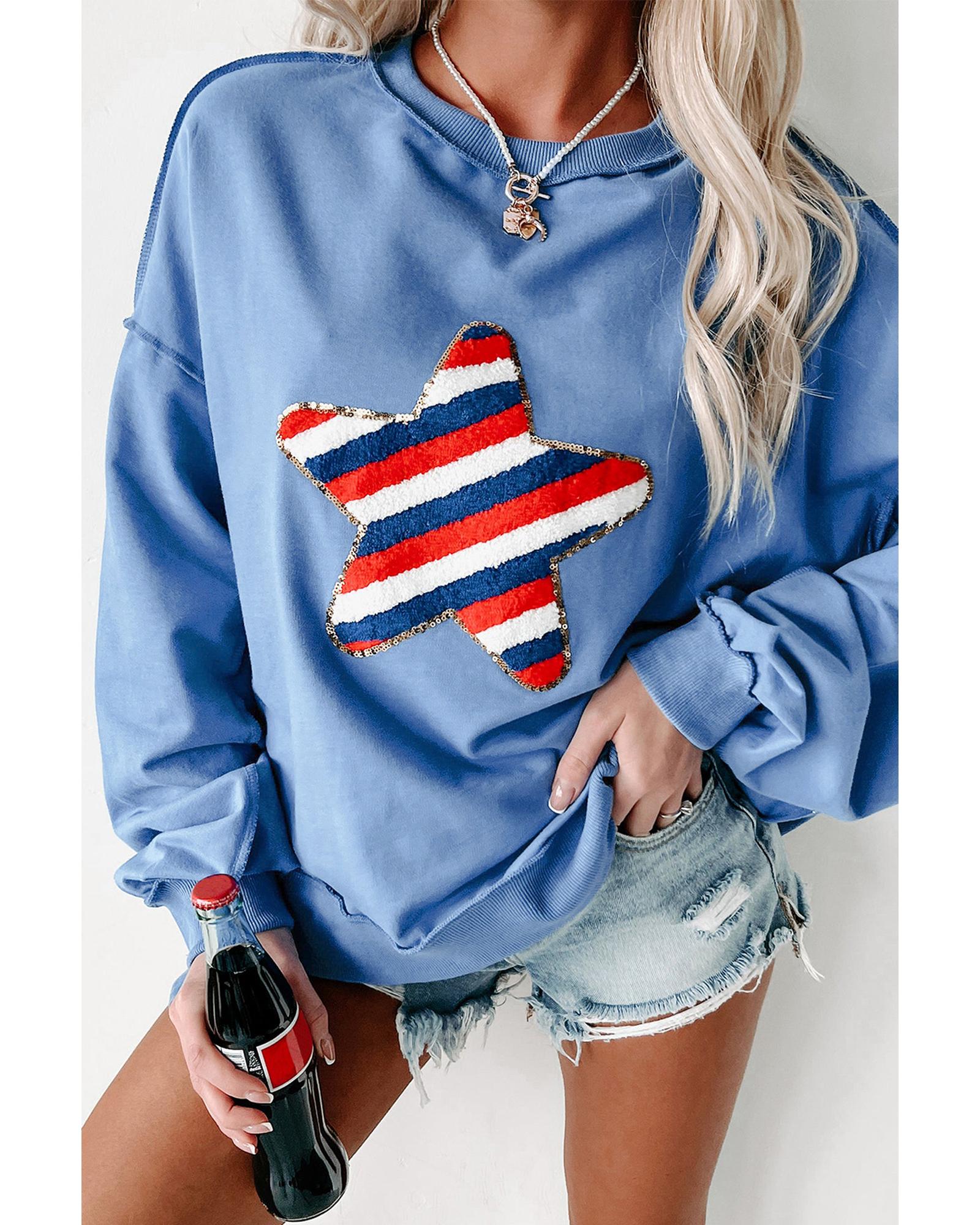 Sky Blue Sequin Trim Embroidered Star USA Pattern Sweatshirt – L