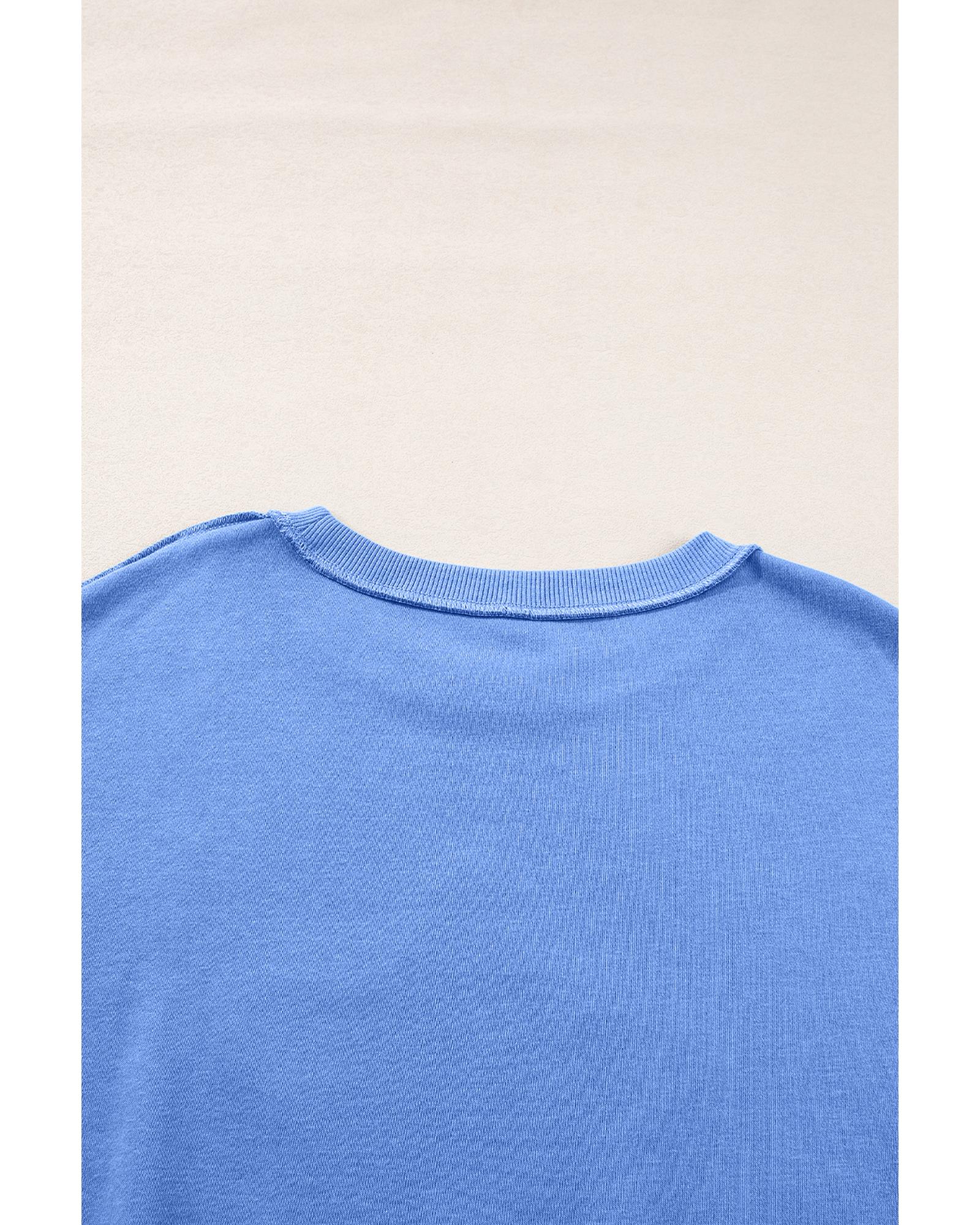This sweatshirt features a sky blue color with sequin trim and embroidered stars, creating a stylish and eye-catching look. Its relaxed fit and drop shoulder design offer comfort and a trendy appearance, making it suitable for various casual occasions.