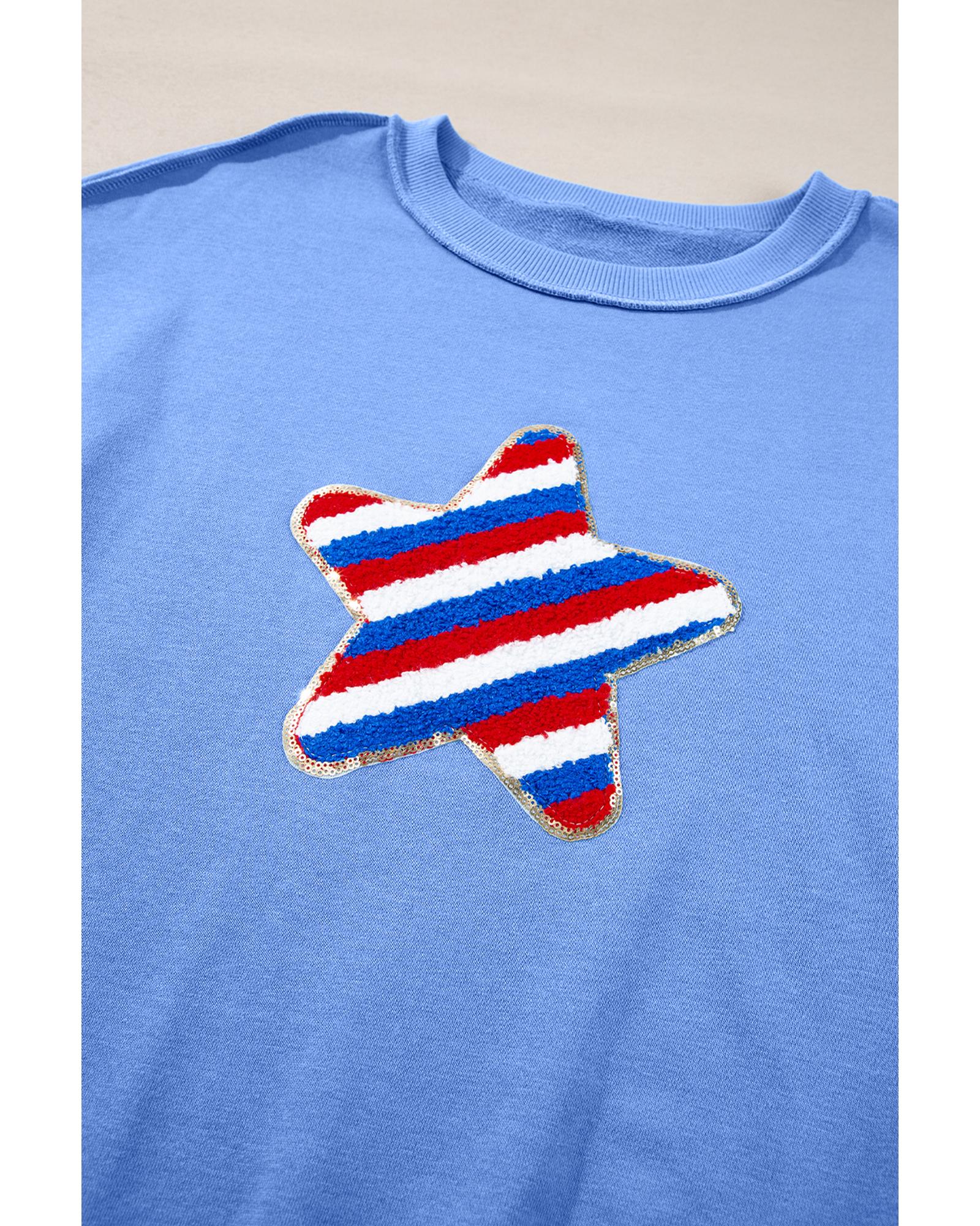 This sweatshirt features a sky blue color with sequin trim and embroidered stars, creating a stylish and eye-catching look. Its relaxed fit and detailed embroidery make it suitable for various casual occasions, especially for celebrating patriotic events.