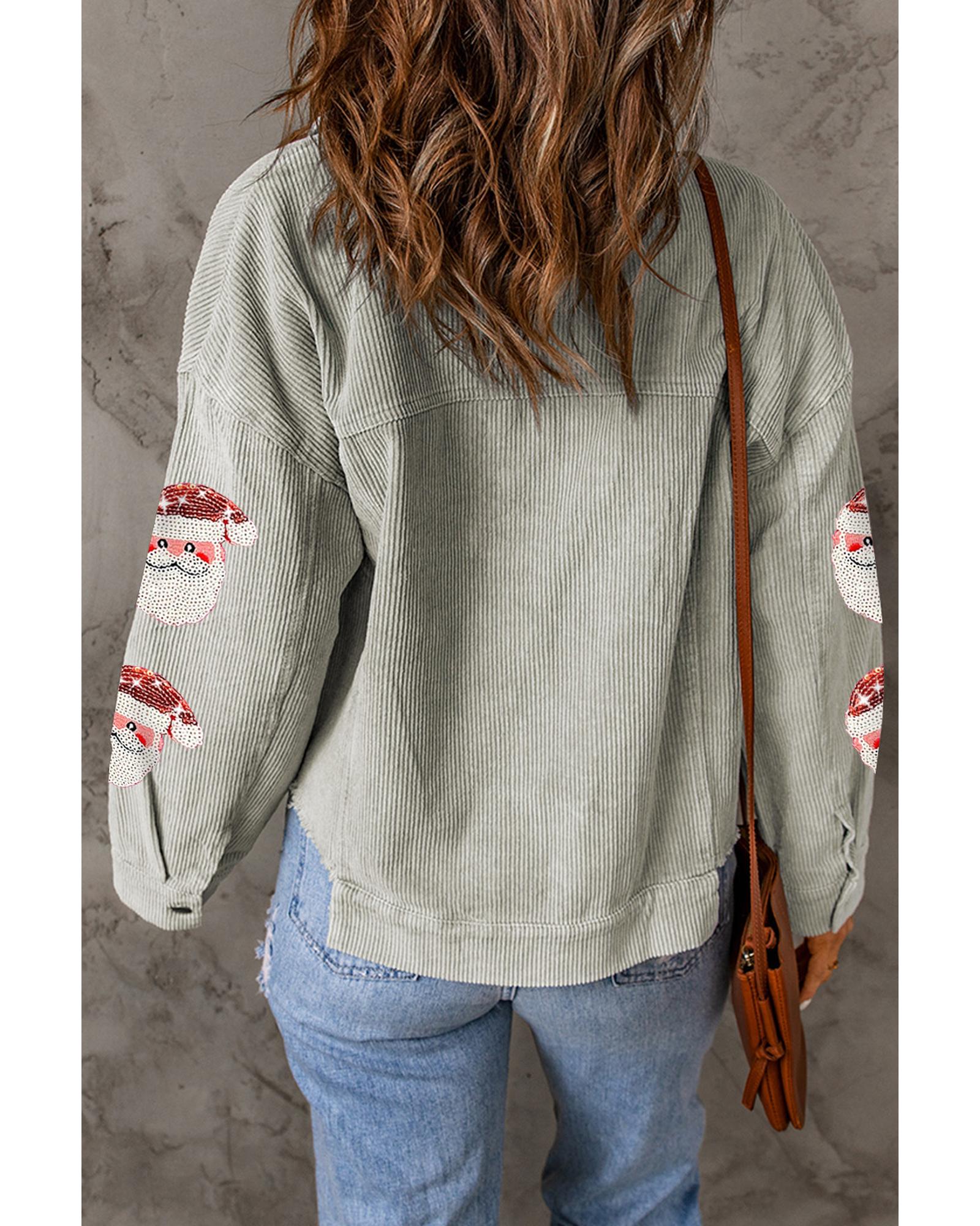 This sky blue sequined Santa Claus flap pocket corduroy jacket combines festive charm with a trendy fitted design. Made from high-quality cotton fabric, it offers comfort and durability, making it suitable for various occasions. The jacket features a unique Santa Claus print on the flap pocket, adding a playful holiday touch. Its versatile style allows for easy pairing with jeans or trousers, perfect for both festive events and everyday wear.