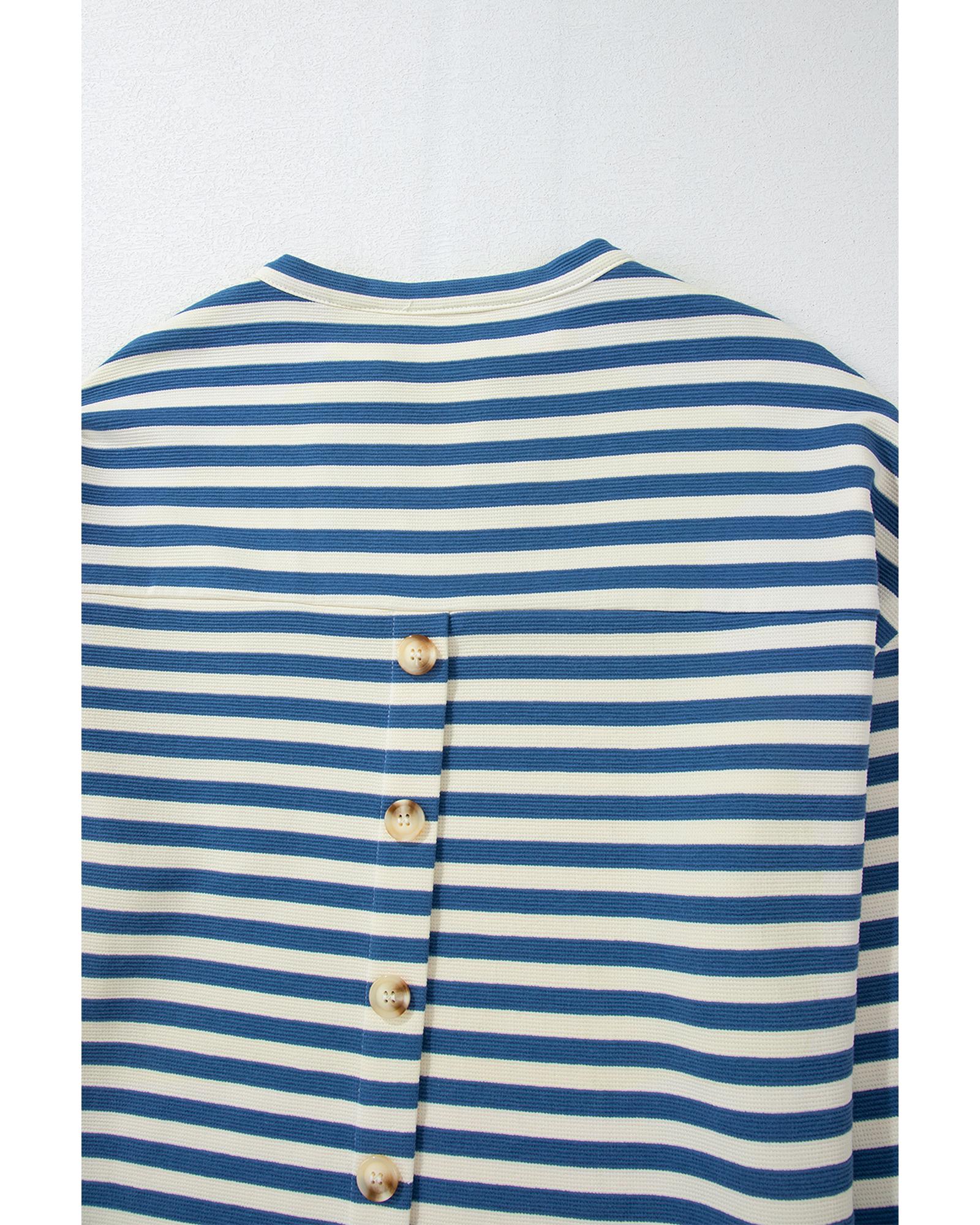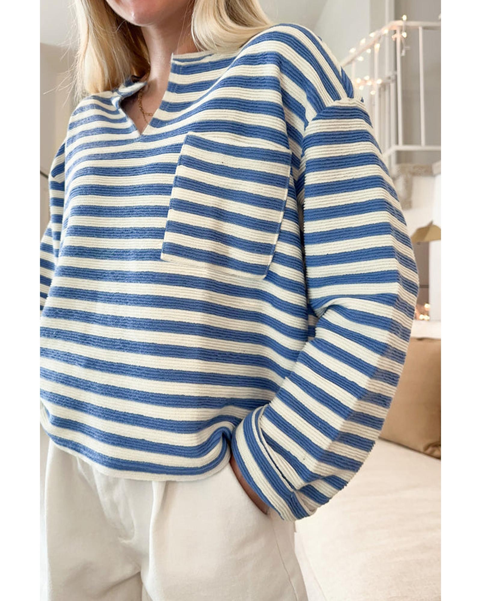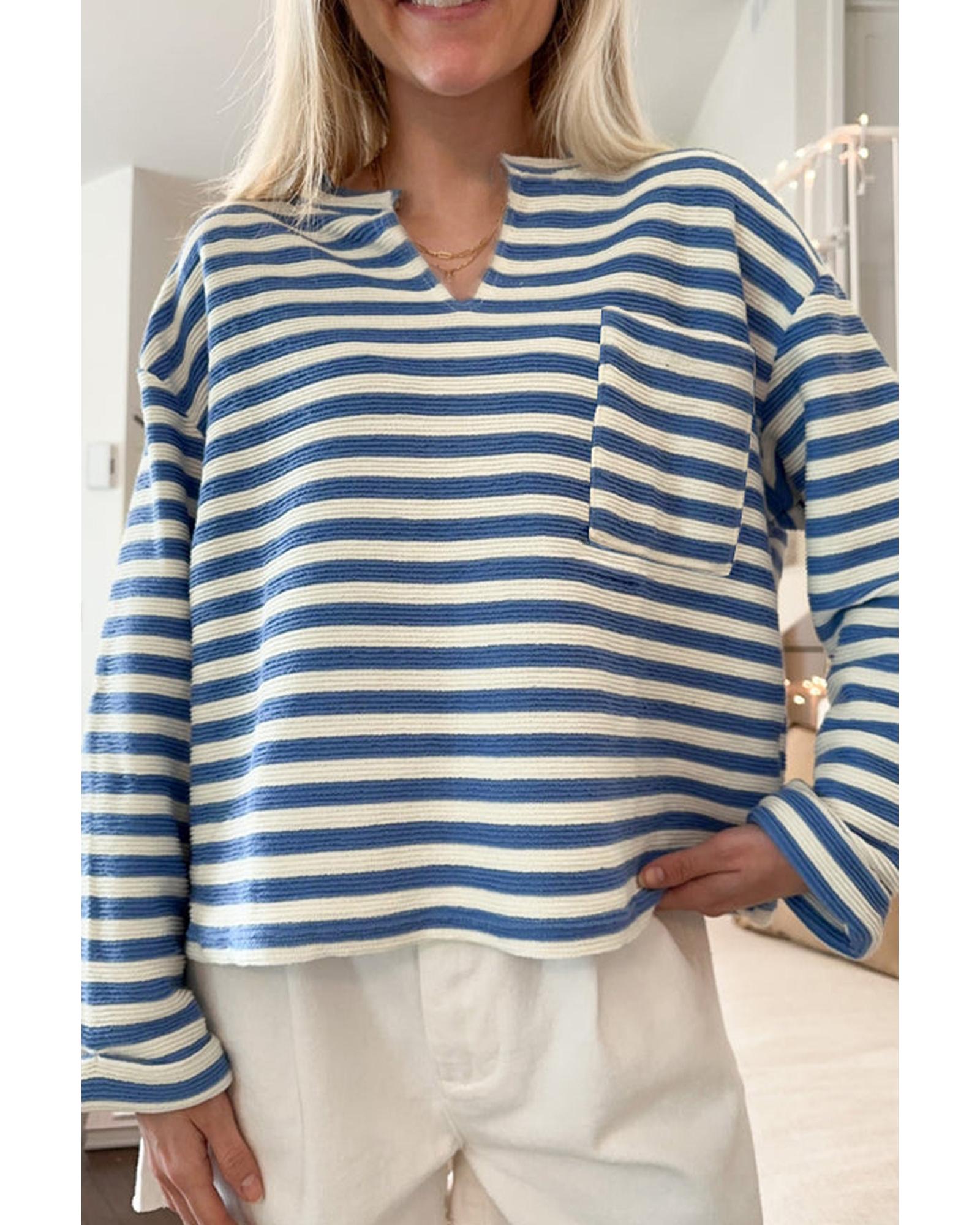 This stylish top features a classic striped pattern with a notched V neckline, chest pocket, and decorative buttons on the back. Designed for a comfortable fit, it is suitable for everyday casual wear and is available in various sizes to accommodate different preferences.