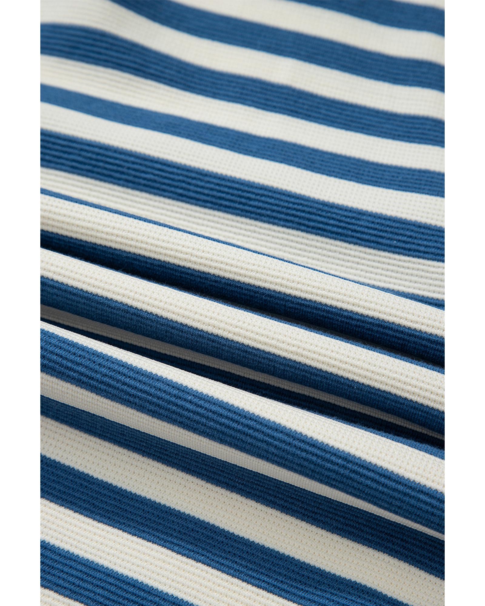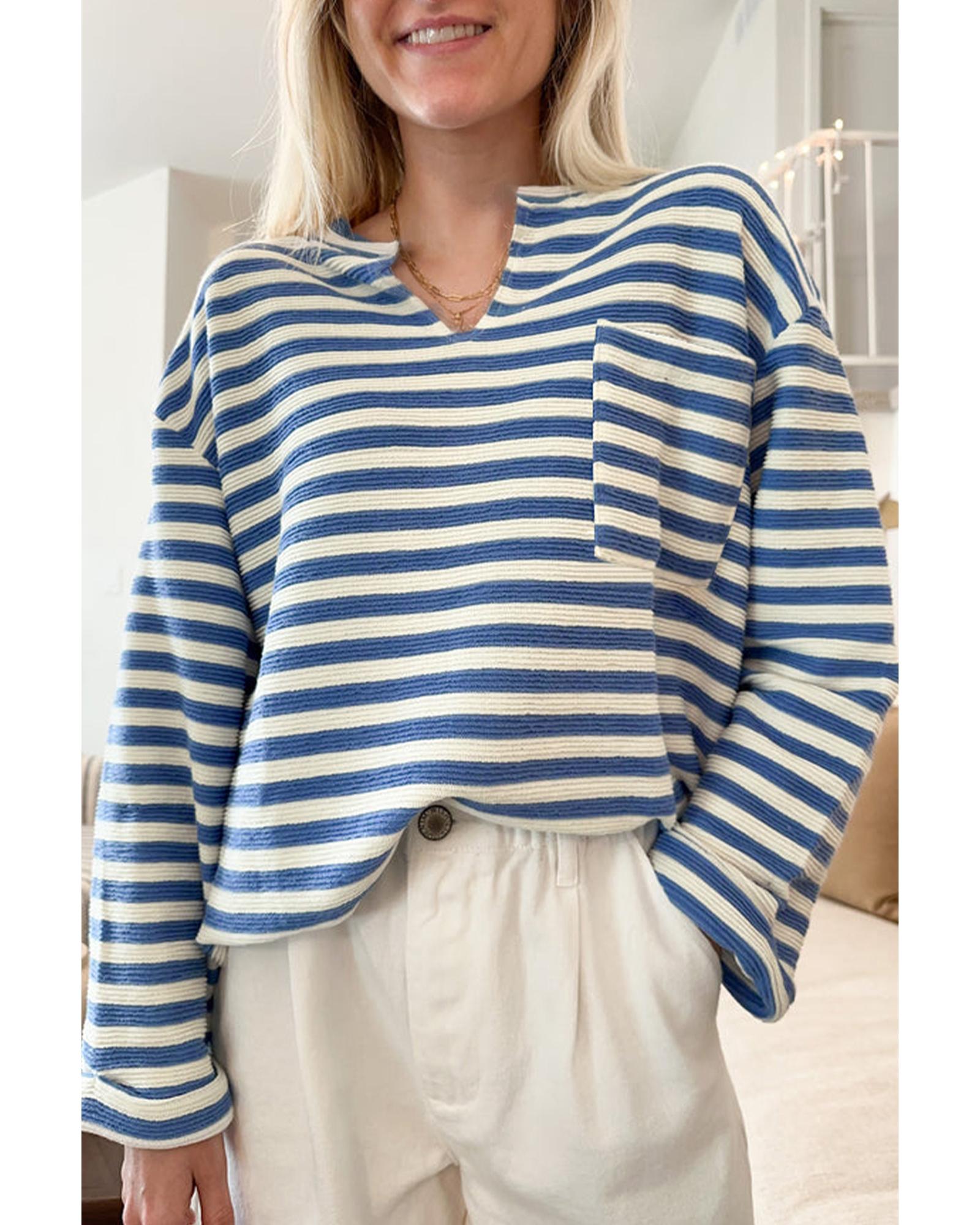 This stylish top features a classic striped pattern with a notched V neckline, chest pocket, and decorative buttons on the back. Designed for a comfortable and casual fit, it is suitable for everyday wear and available in various sizes to suit different preferences.
