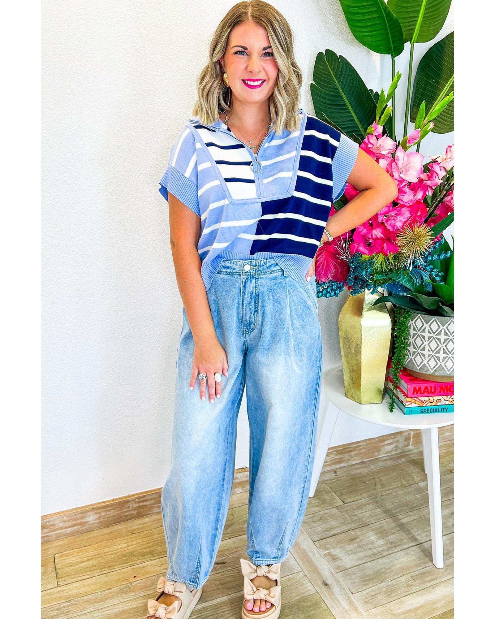 This Sky Blue Stripe Colorblock Quarter Zip Collar Sweater Vest offers a stylish and trendy fitted look, perfect for casual or semi-formal occasions. Designed specifically for women, it combines comfort with modern fashion elements to enhance your wardrobe.