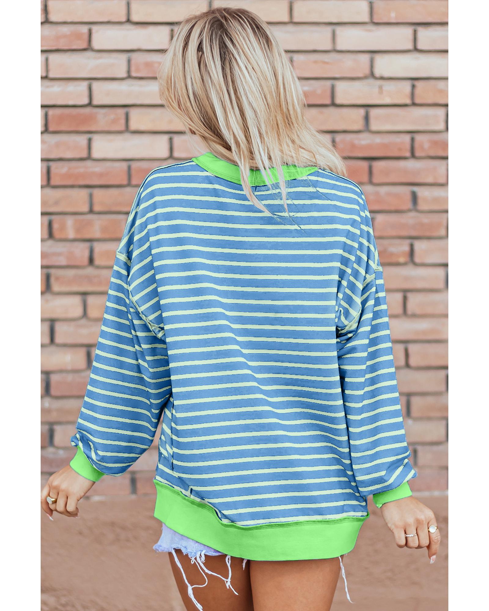 This high-low pullover tunic sweatshirt features a stylish sky blue stripe design with contrasting trim details. Its trendy fit and flattering length make it a versatile addition to any wardrobe, suitable for casual and fashionable looks.