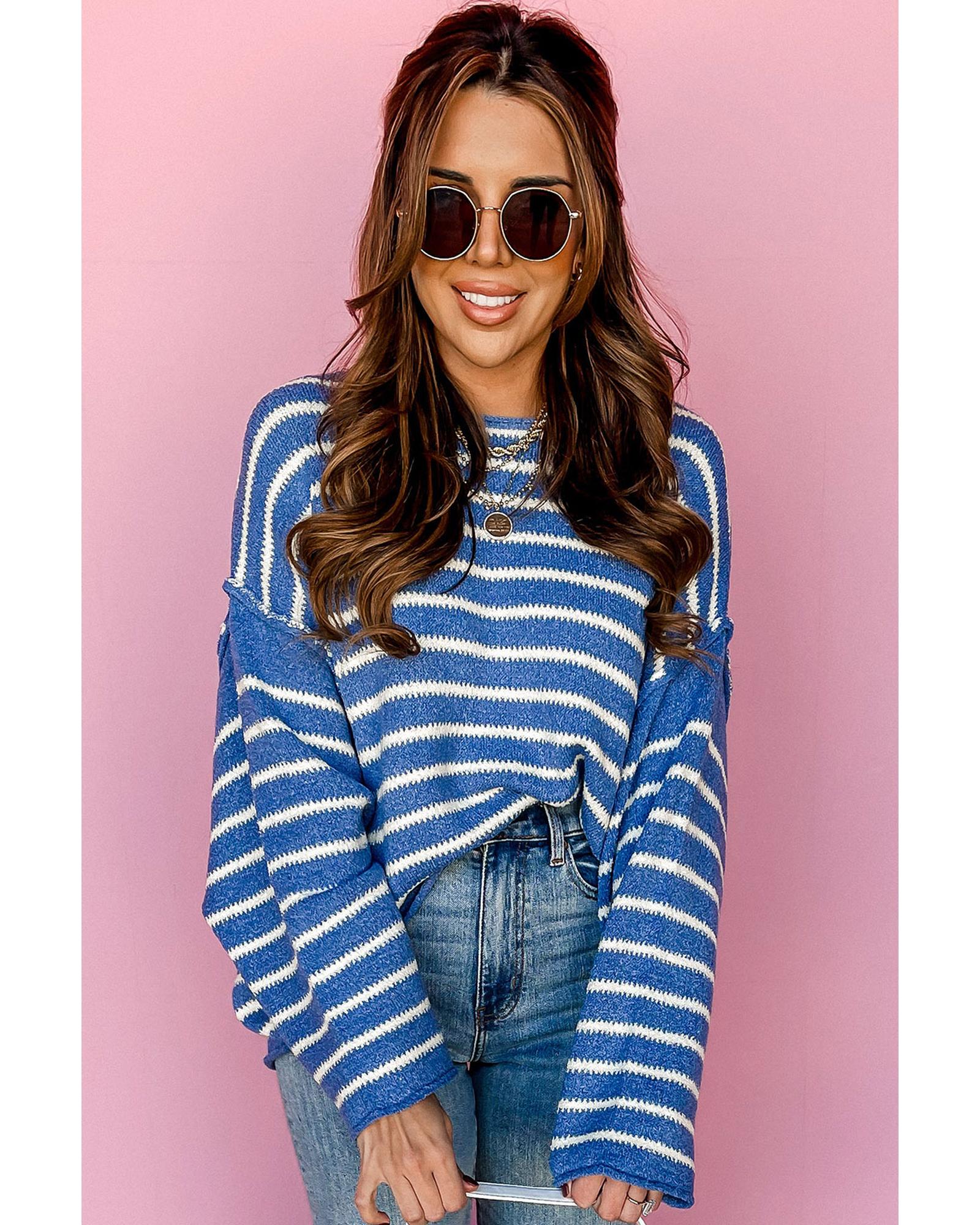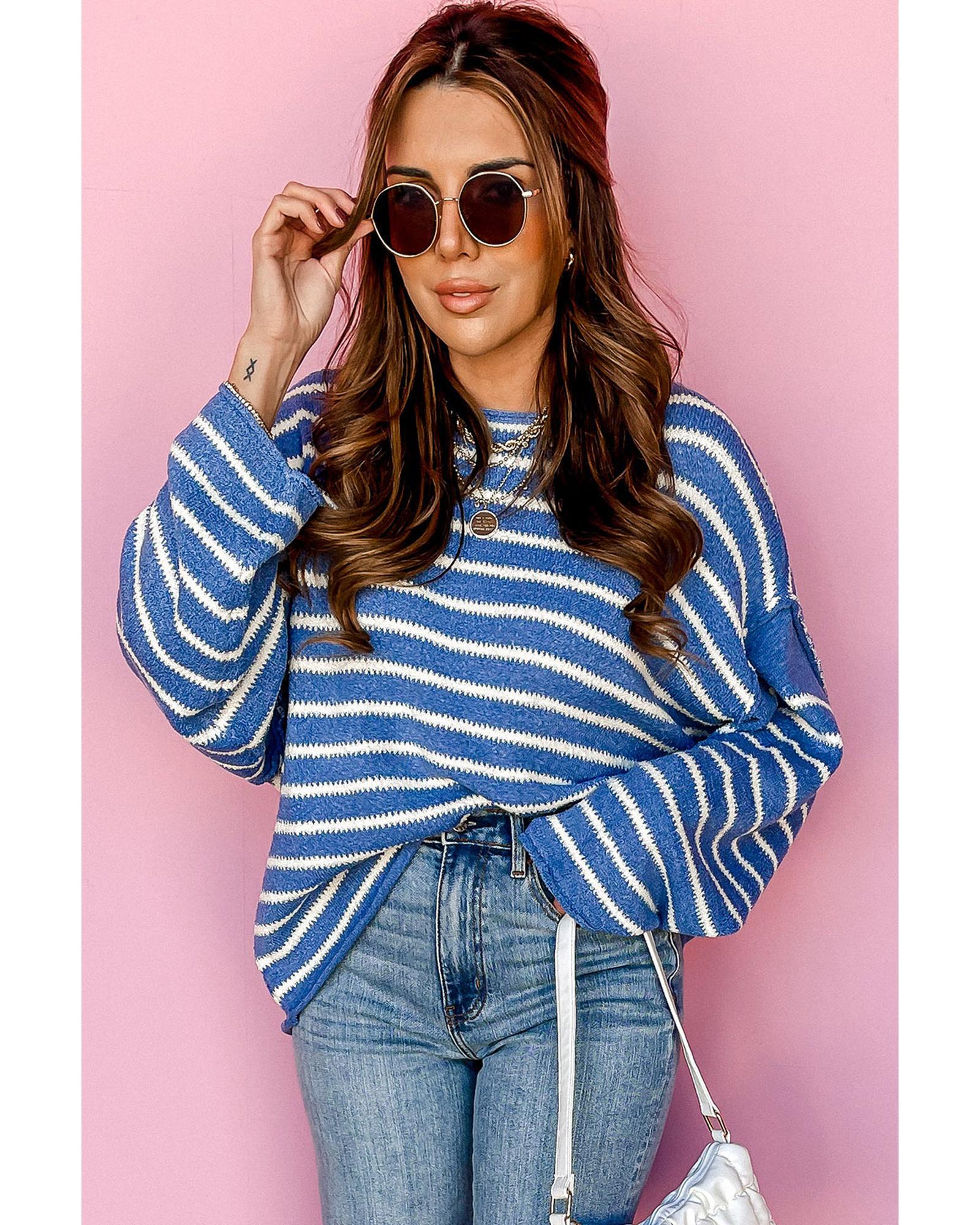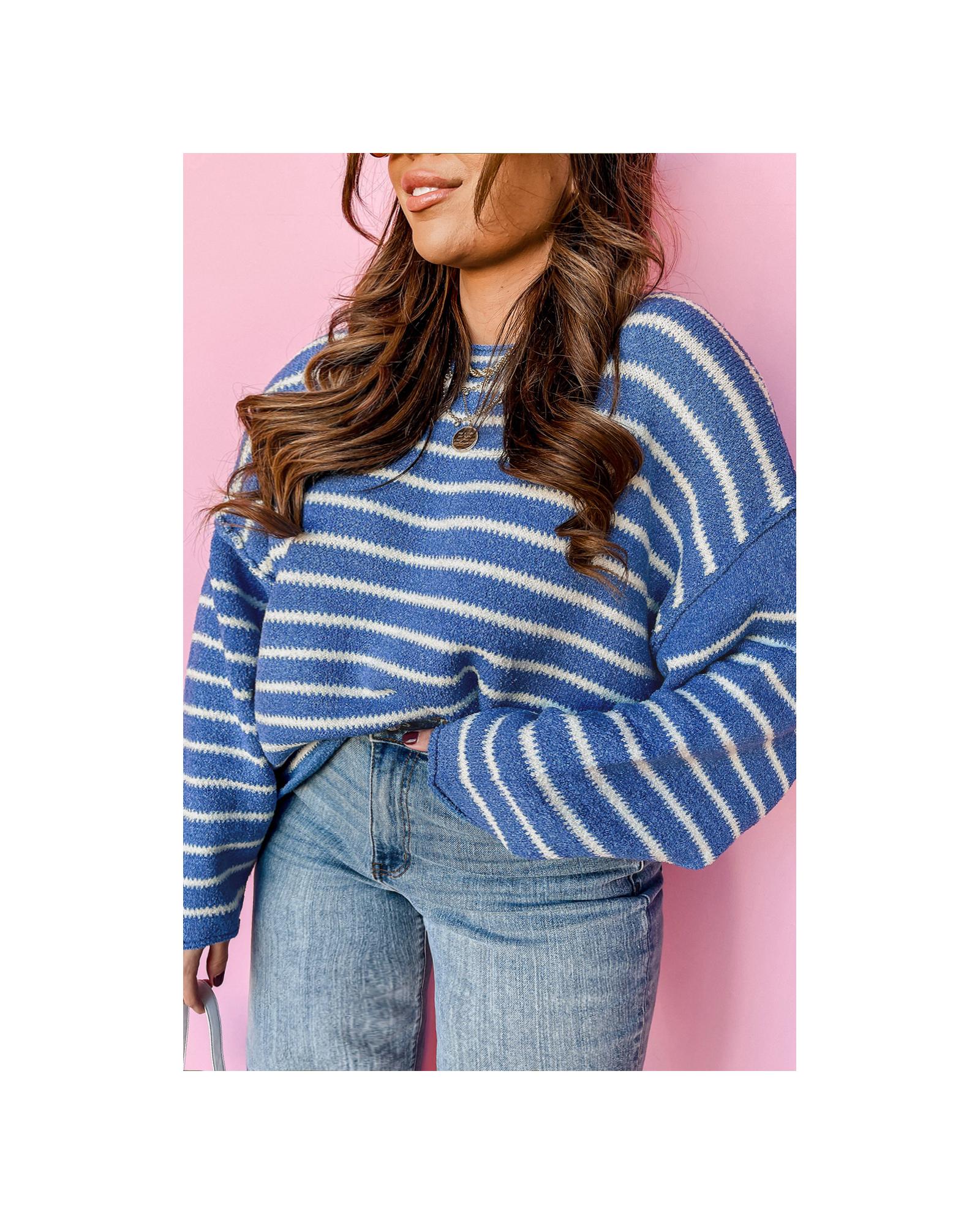 Sky Blue Stripe Drop Shoulder O Neck Plus Size Sweater – 2X