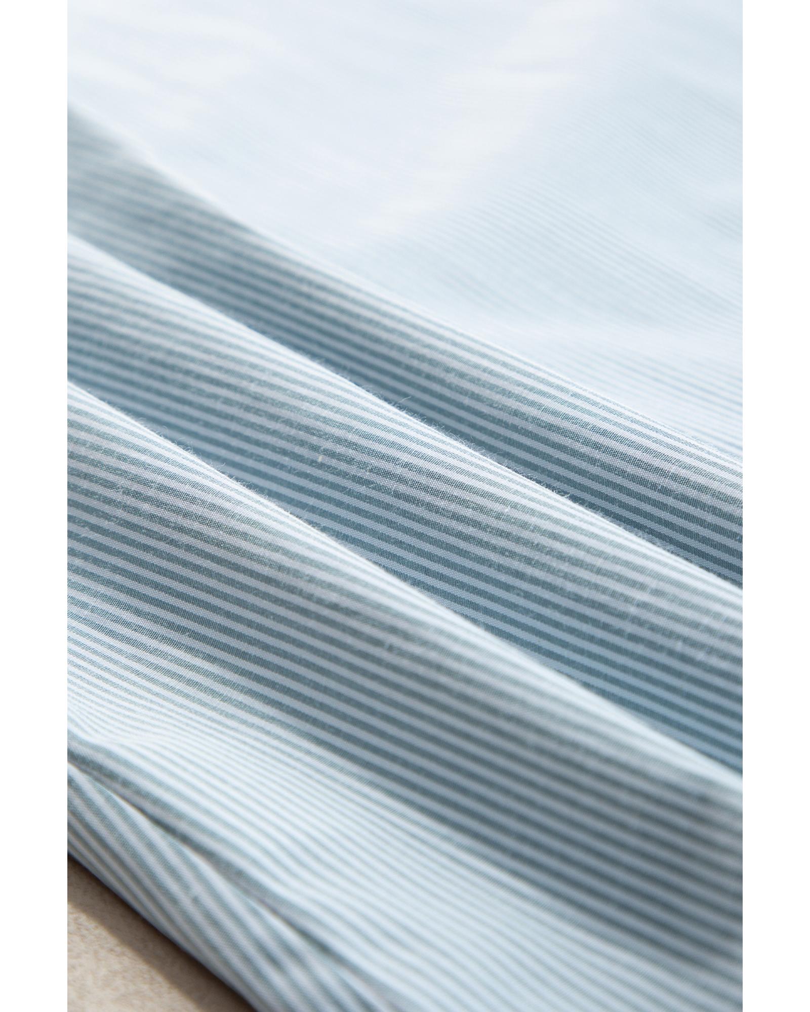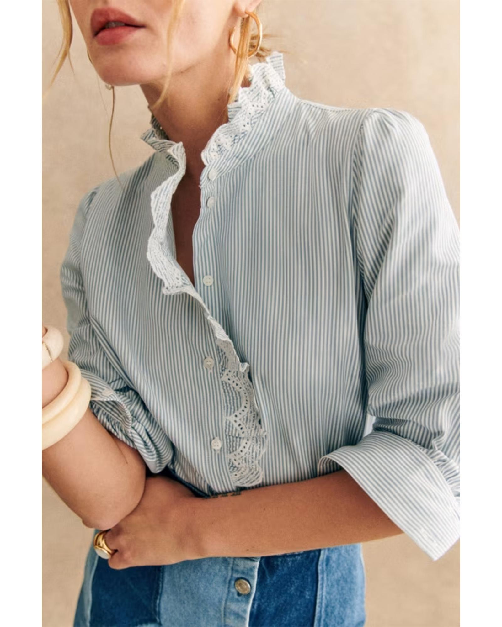 This sky blue striped shirt features a stylish turn-down collar and long sleeves, offering a polished and versatile look suitable for various occasions. The delicate frilled trim adds a touch of elegance, making it a perfect balance between chic and casual style.