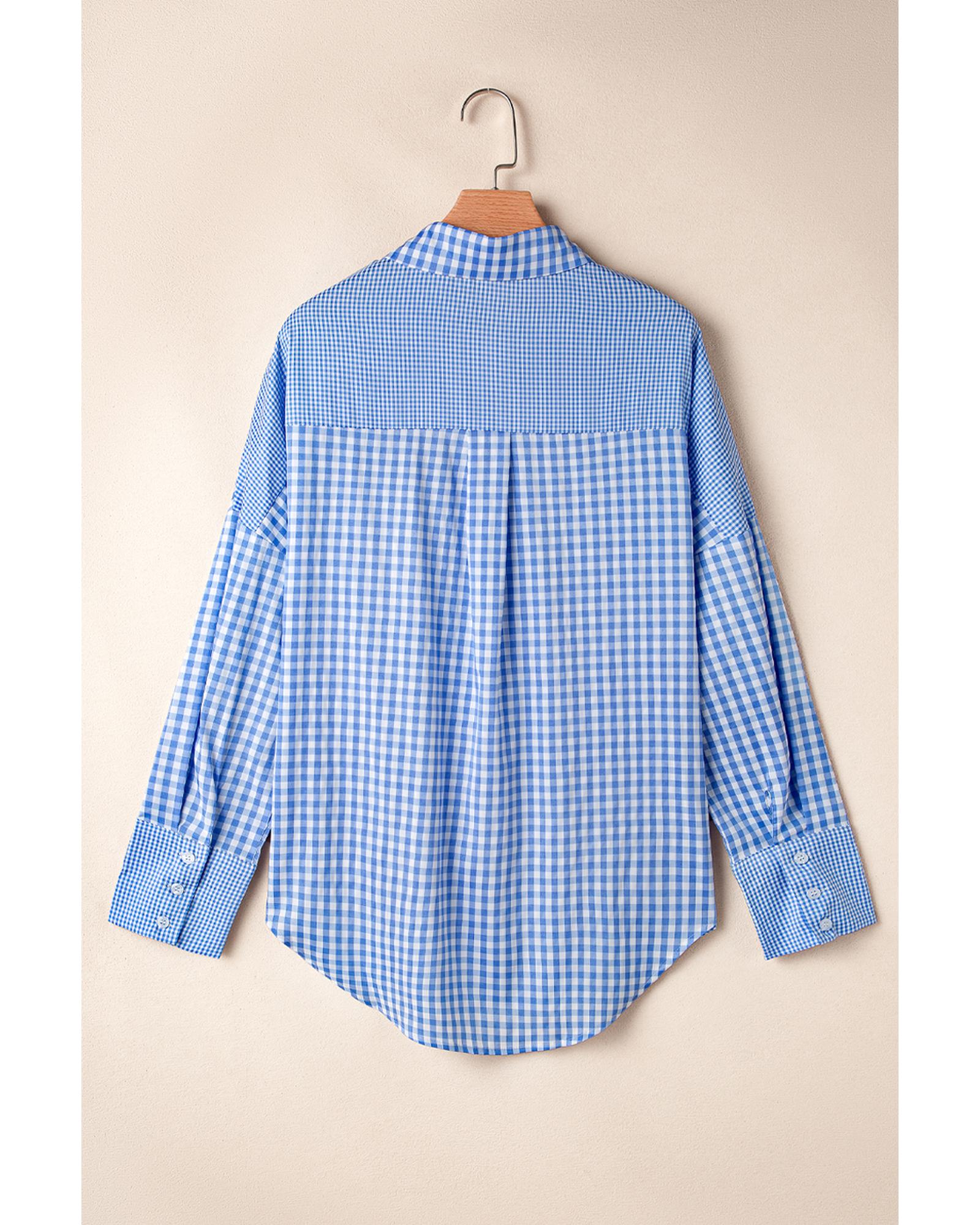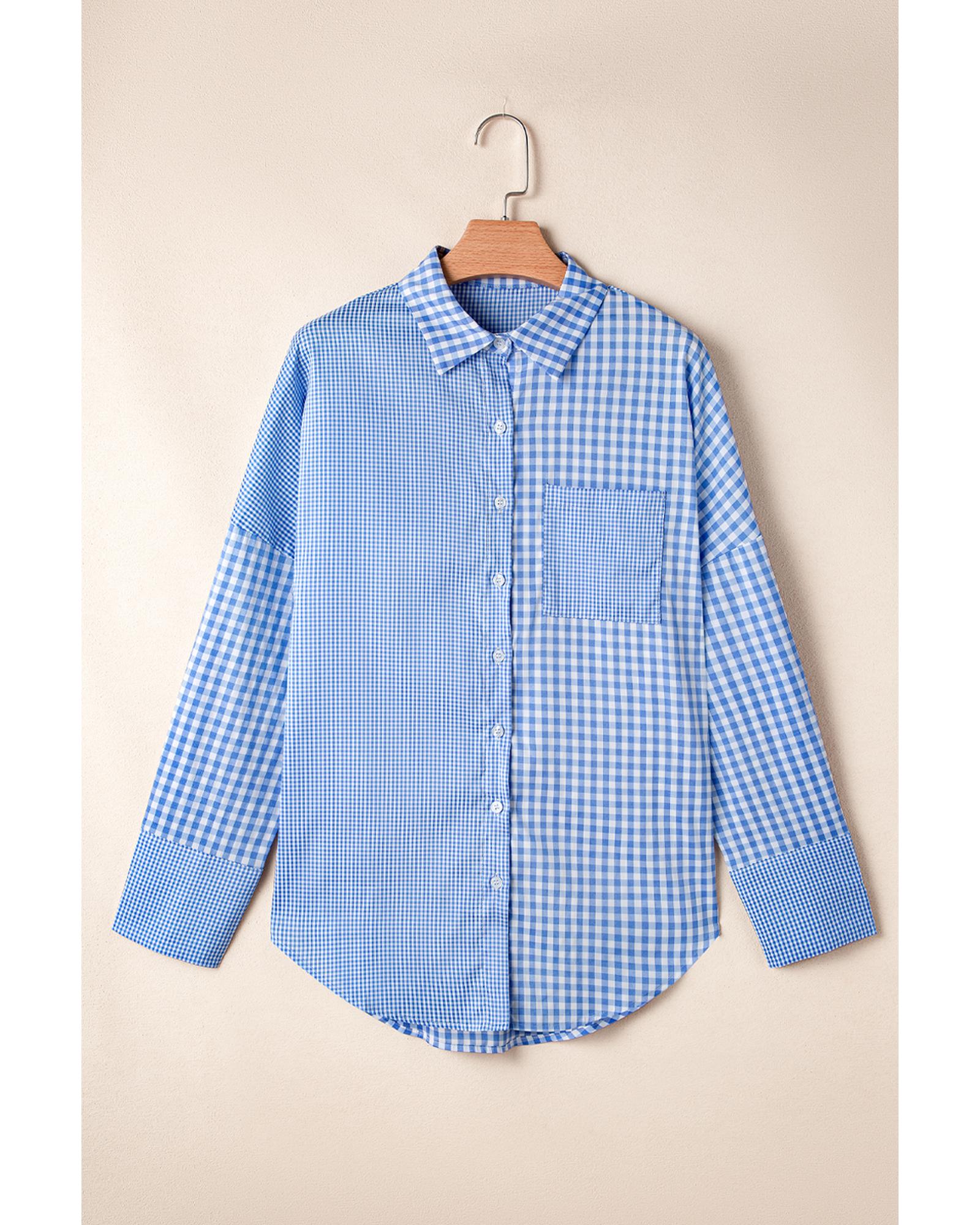 This long sleeve shirt features a stylish sky blue stripe plaid patchwork design, combining classic patterns with a modern touch. It is crafted to provide both warmth and a sophisticated silhouette, making it suitable for various casual and chic occasions.