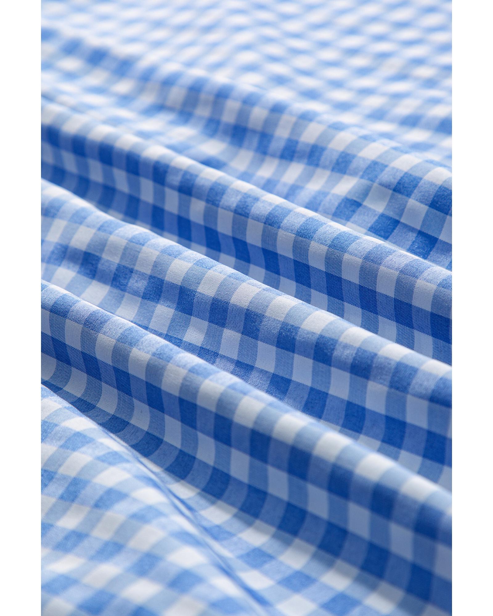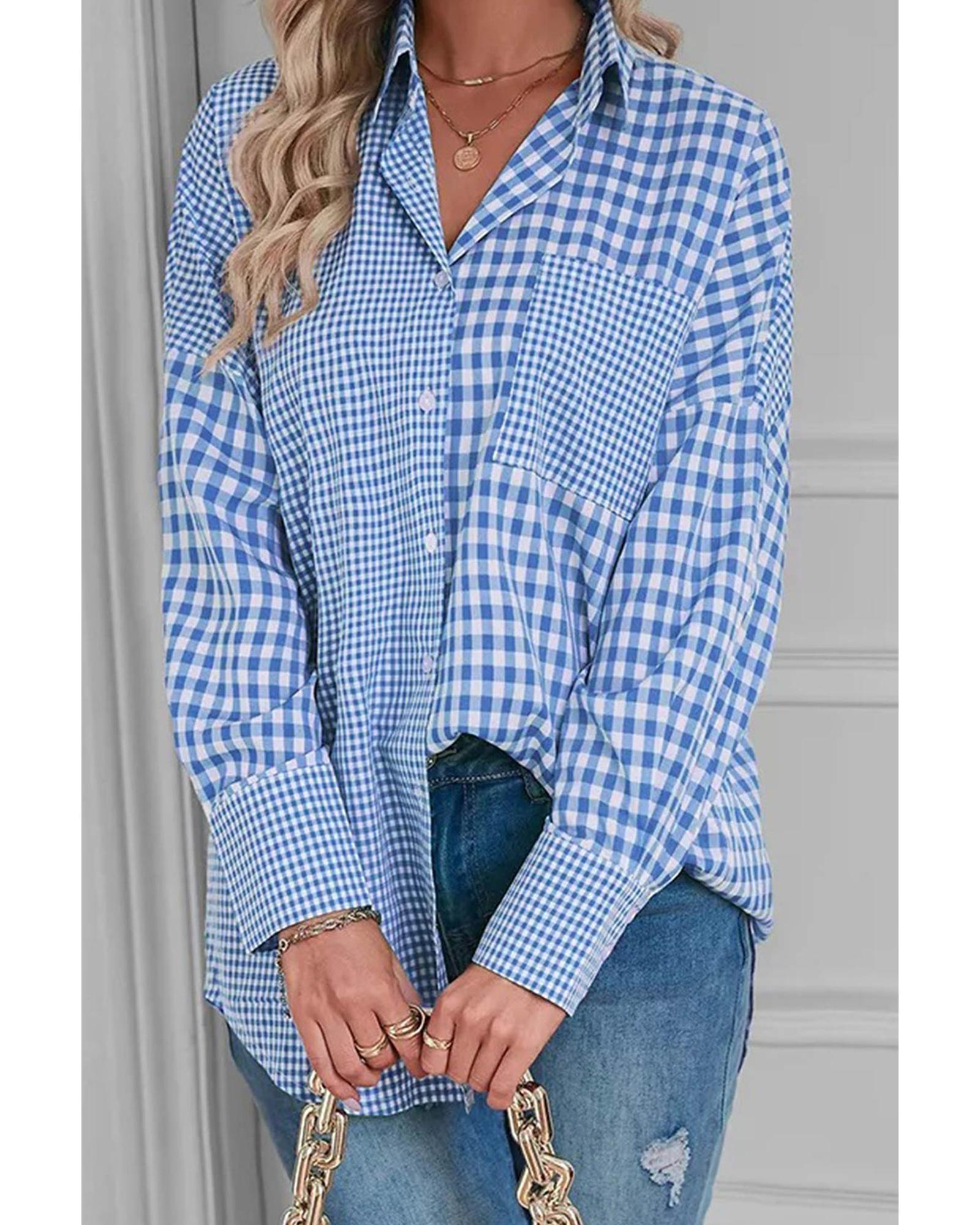 This long sleeve shirt features a stylish sky blue stripe plaid patchwork design, combining classic patterns with a modern touch. It is crafted to provide both warmth and a sophisticated silhouette, making it suitable for a chic yet casual look. The button-up front adds effortless elegance to the overall style.