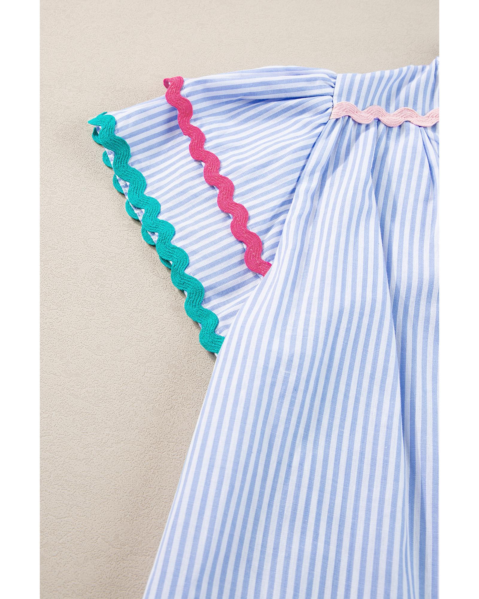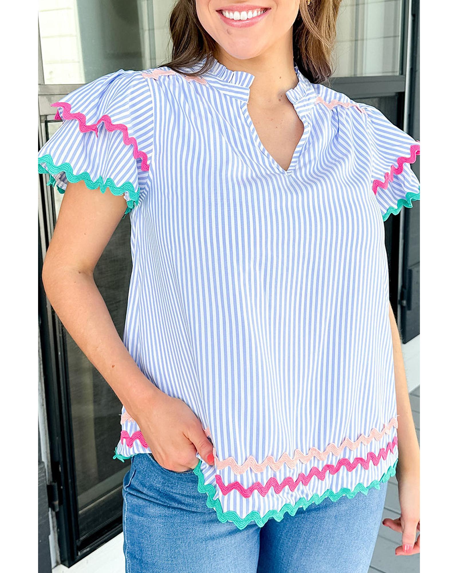 This sky blue striped blouse features a stylish ricrac trim and a split neck design that adds a touch of sophistication. The ruffled sleeves provide a feminine and charming detail, making it suitable for both casual and chic occasions. Crafted from 100% cotton, this blouse offers comfort and breathability. Available in multiple sizes, it is designed to fit a trendy, fitted look.