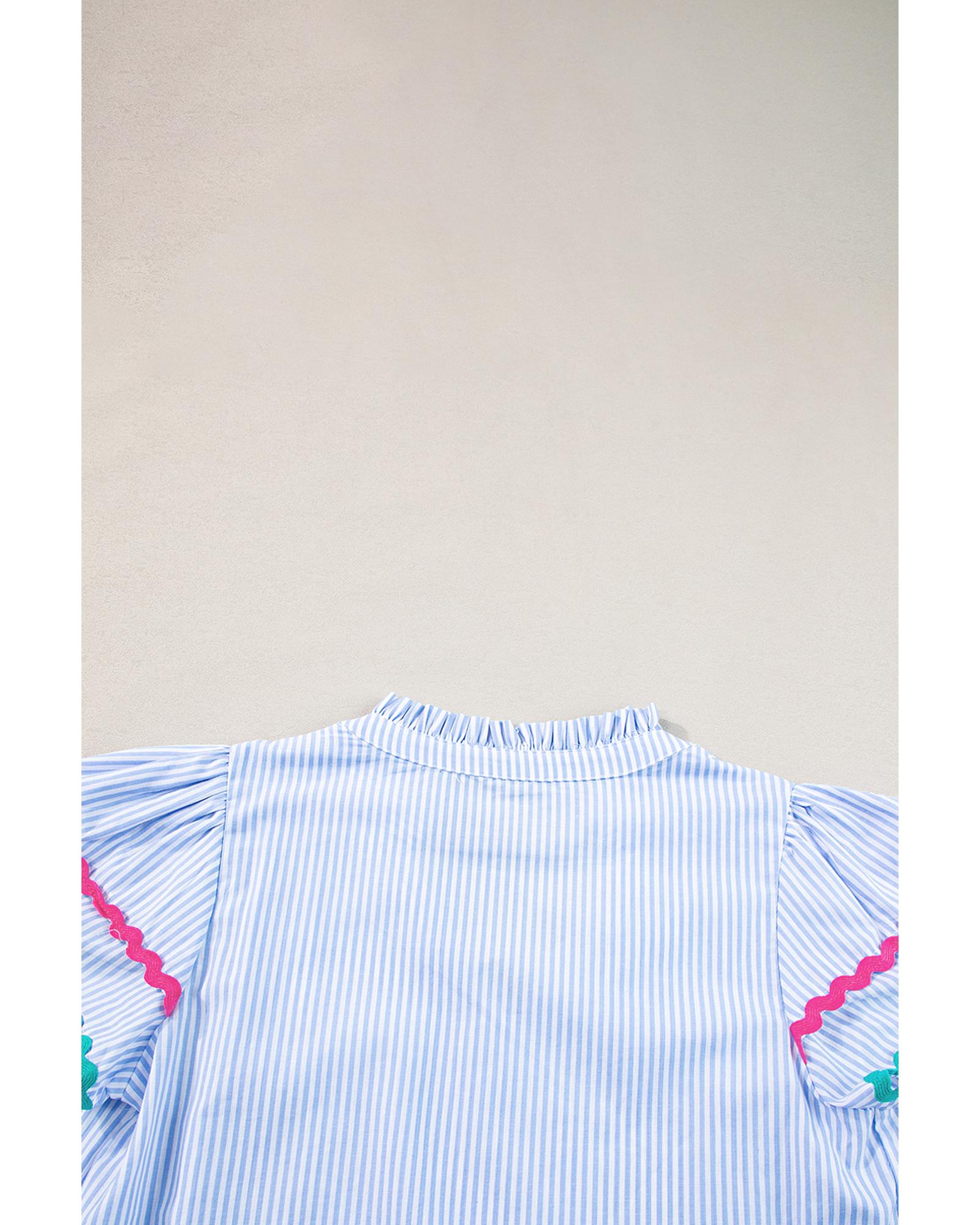 Sky Blue Stripe Ricrac Trim Split Neck Striped Ruffled Sleeve Blouse – M