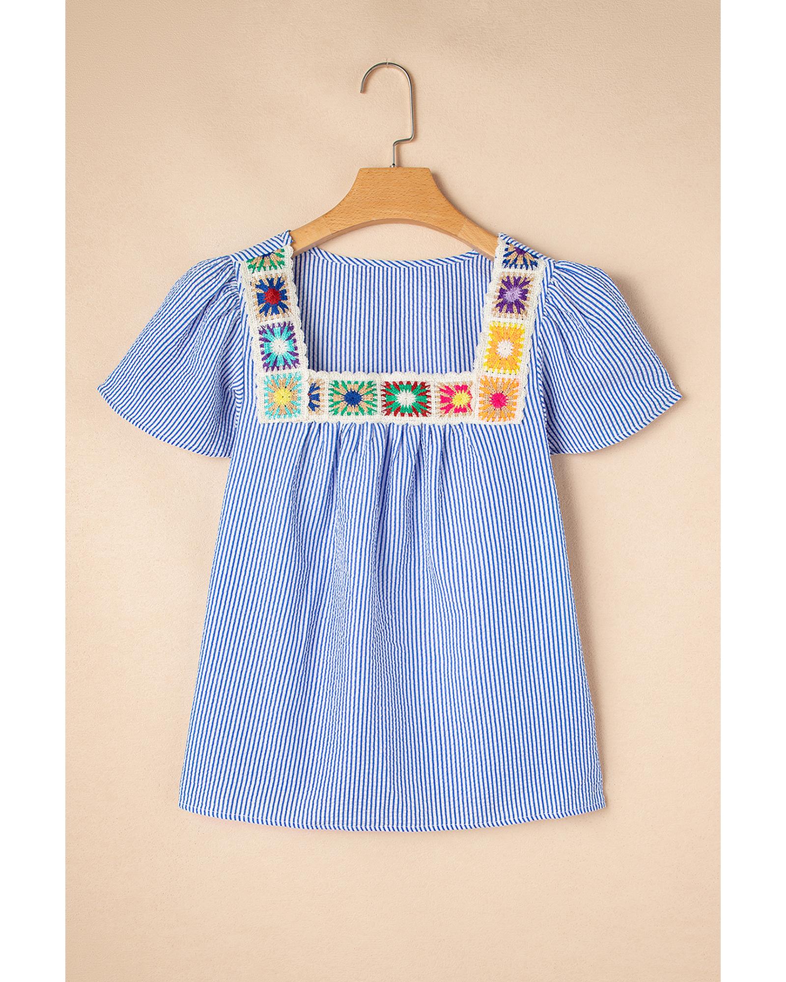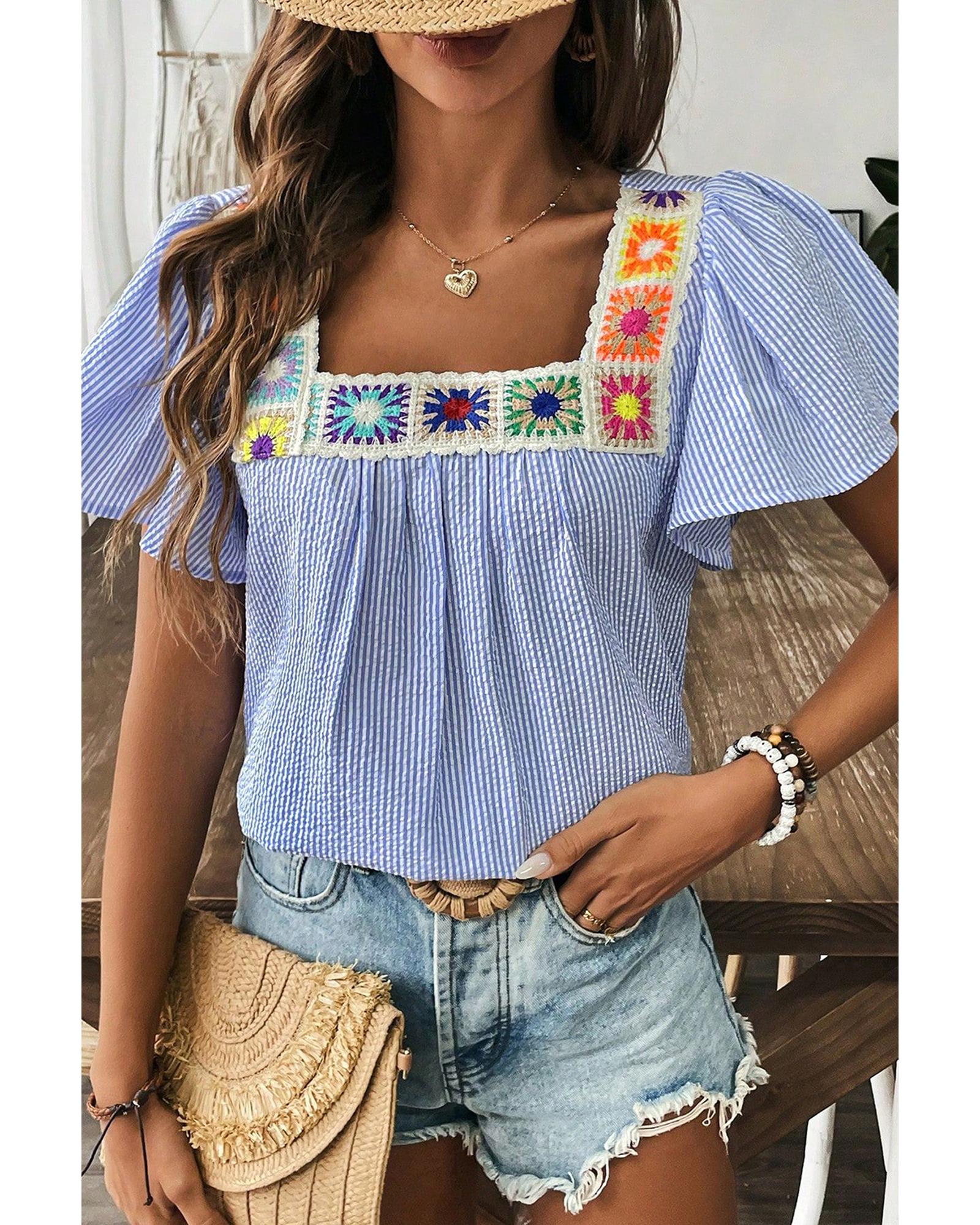 Sky Blue Stripe Textured Ruffle Short Sleeve Boho Detail Square Neck Blouse – M