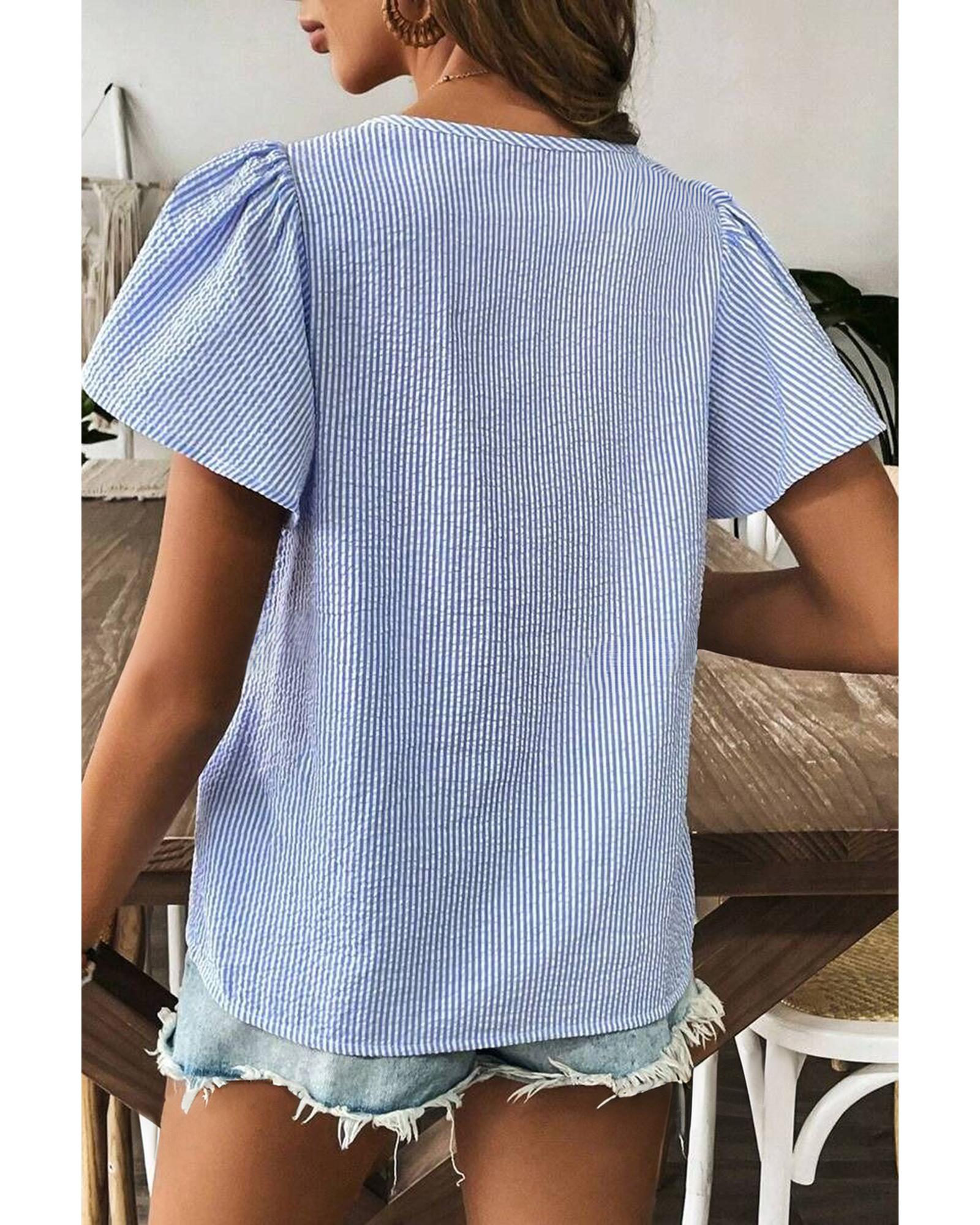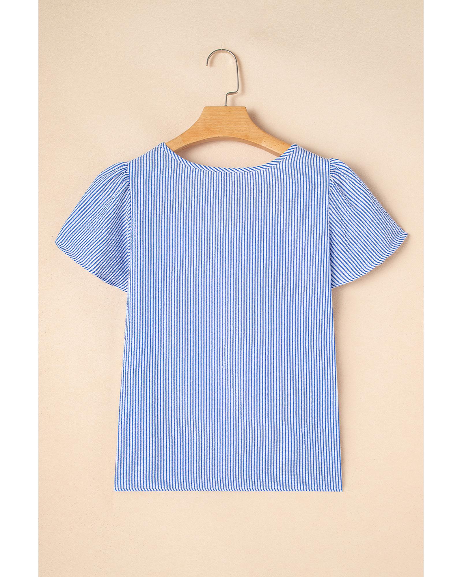 This stylish blouse features a textured stripe pattern with a relaxed fit, making it a versatile addition to your wardrobe. The square neckline and ruffle short sleeves add charming details, while the soft lightweight fabric ensures comfort throughout the day. Perfect for pairing with casual or dressy bottoms for various occasions.