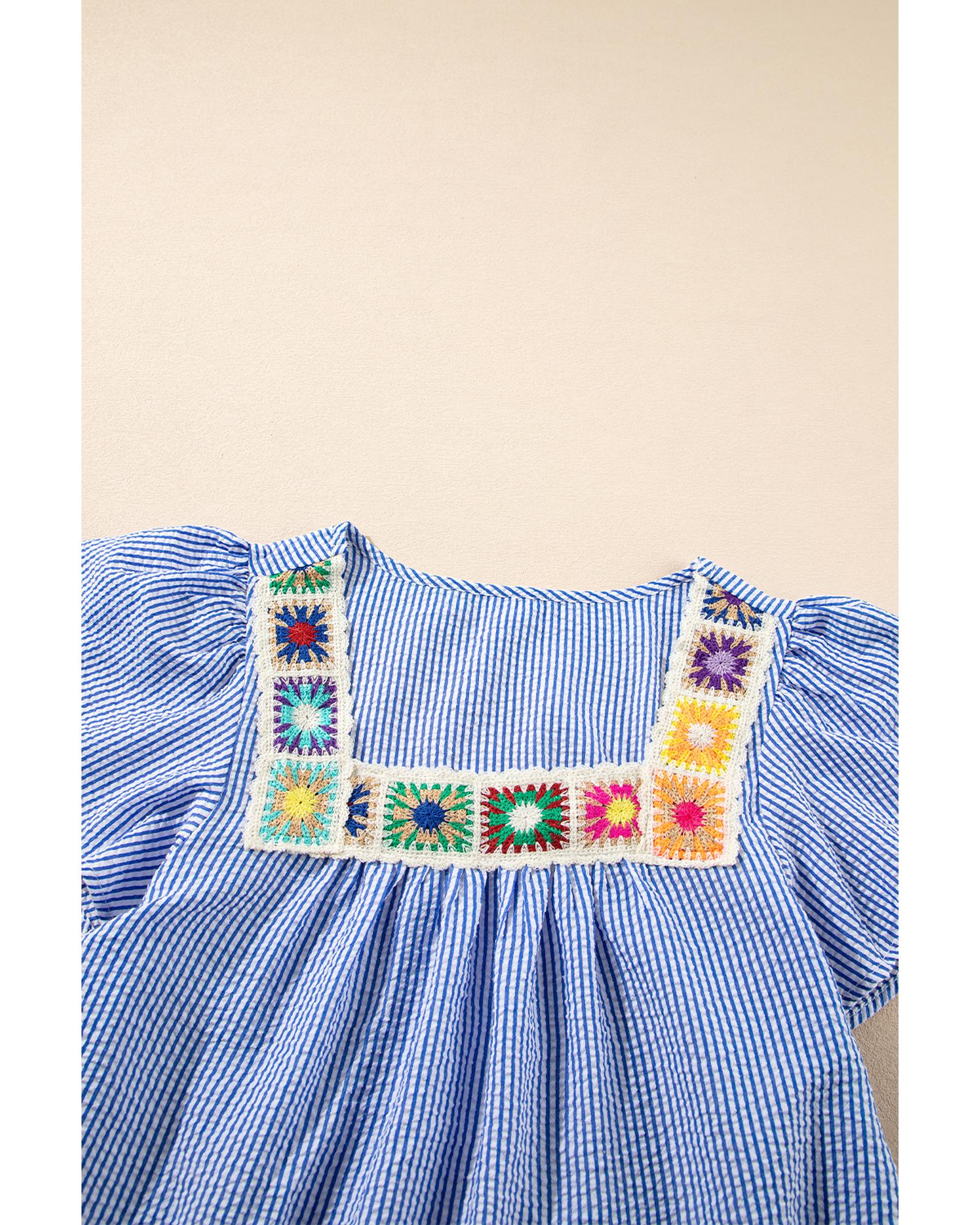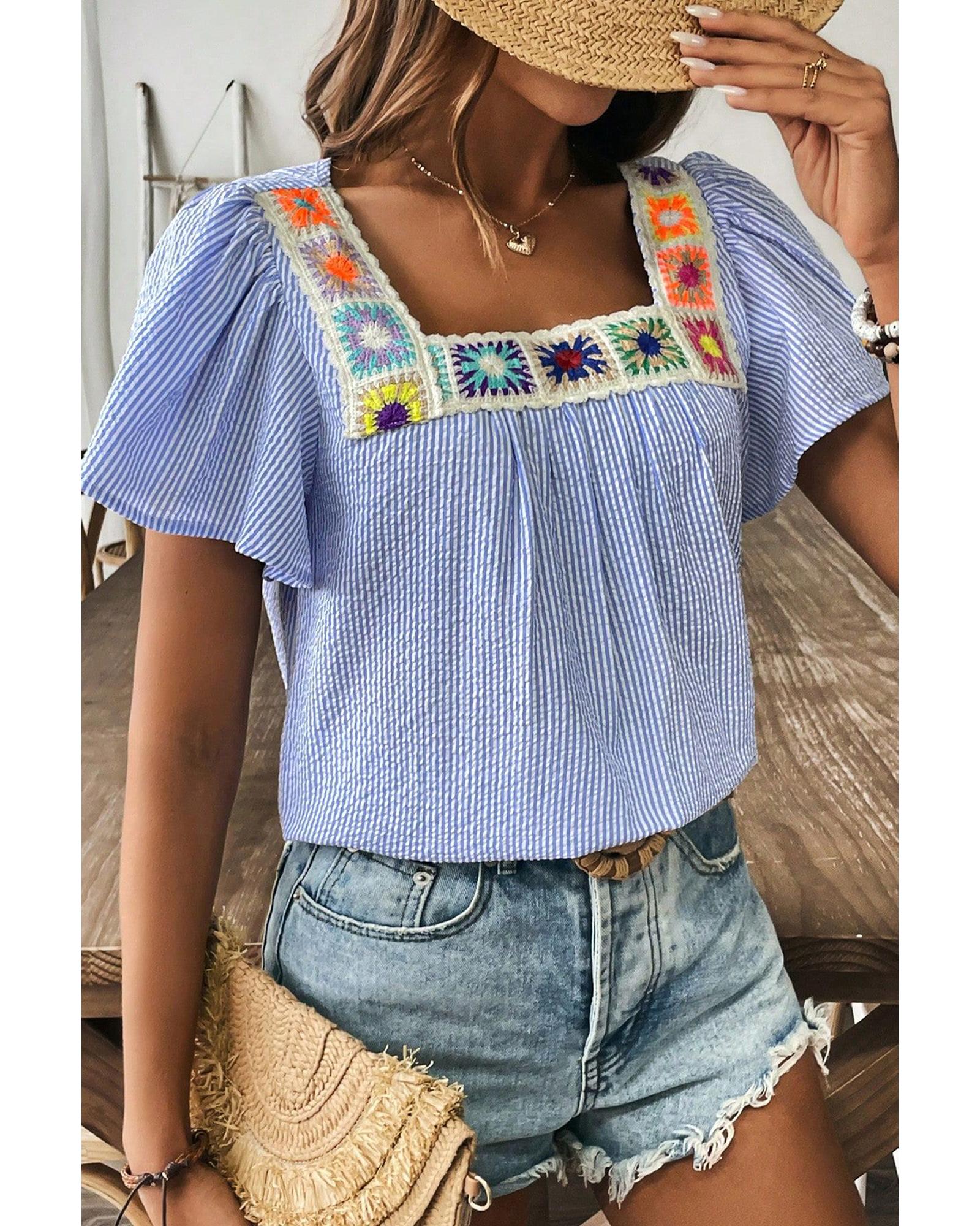 Sky Blue Stripe Textured Ruffle Short Sleeve Boho Detail Square Neck Blouse – S