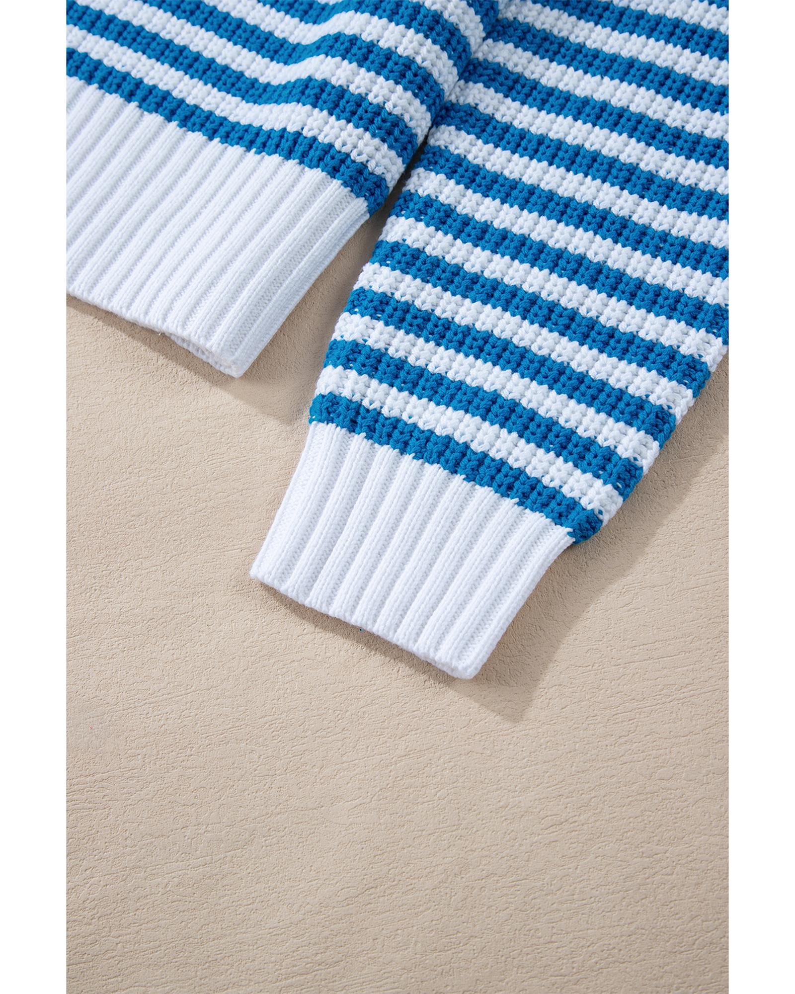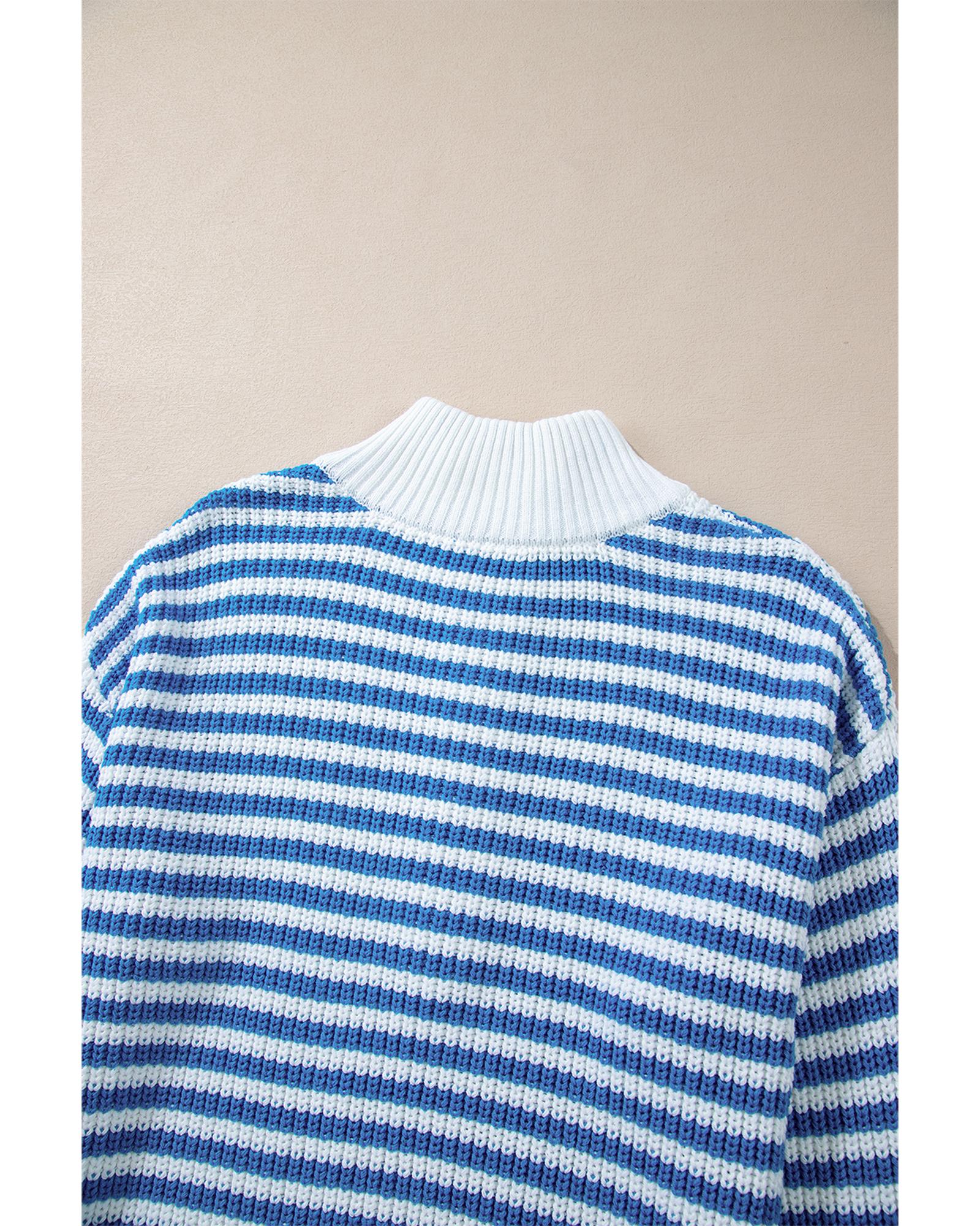 Sky Blue Stripe Zip up Collar Drop Shoulder Sweater – M
