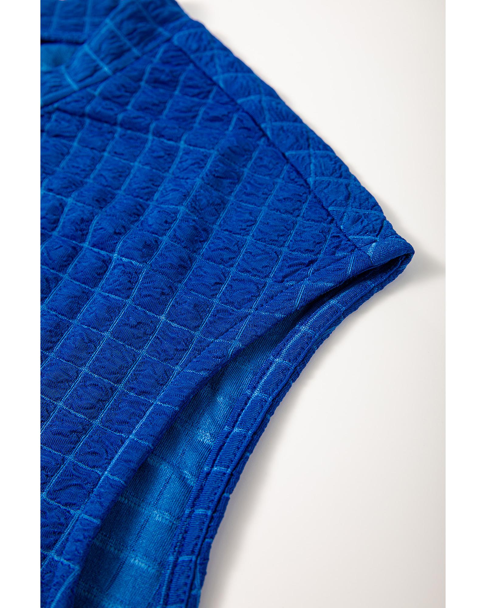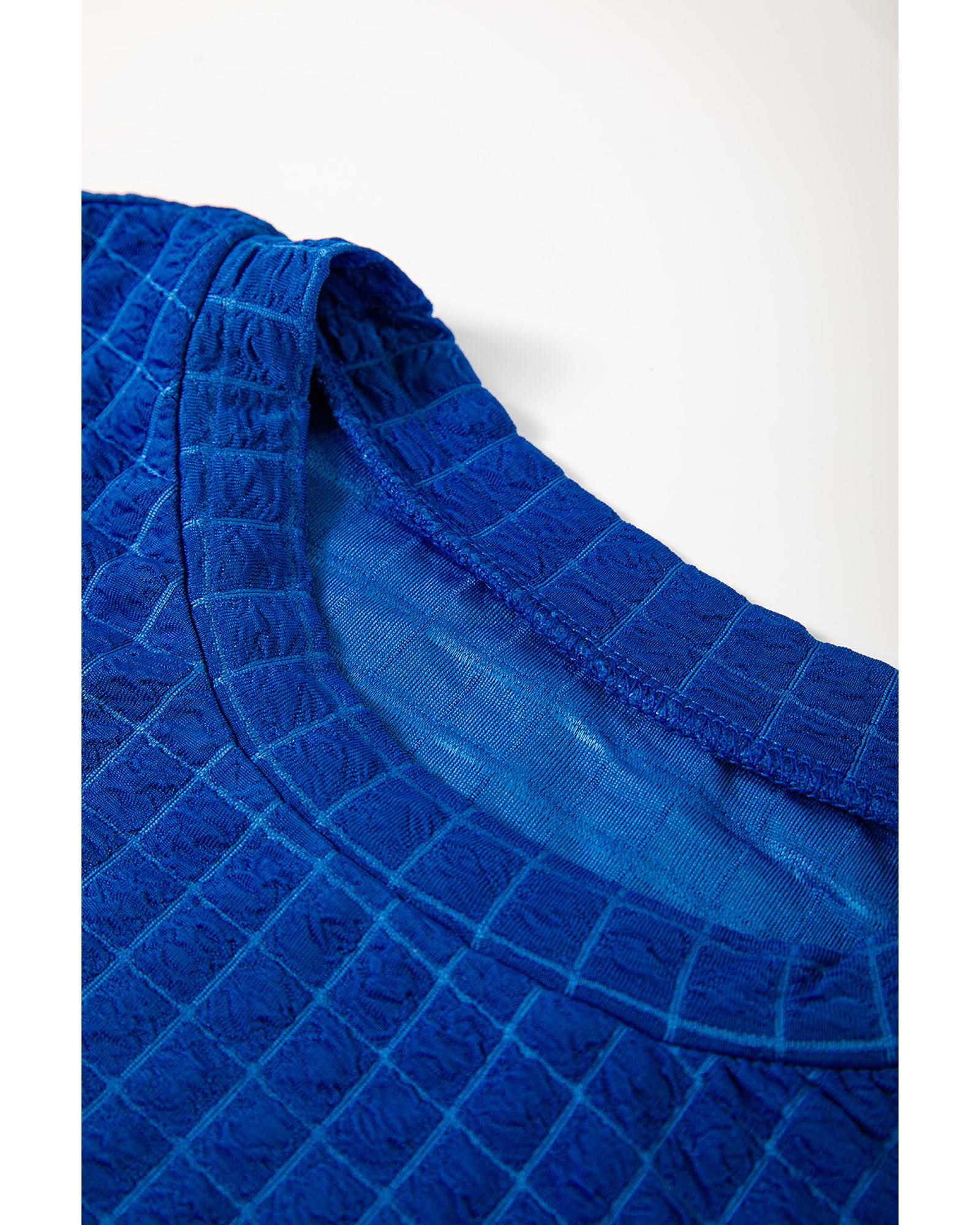 This stylish set features a textured knit fabric in a vibrant sky blue color, combining a cap sleeve T-shirt with wide-leg pants for a comfortable and fashionable look. Designed with a trendy fitted silhouette, it is suitable for everyday wear or lounging, offering both style and comfort.