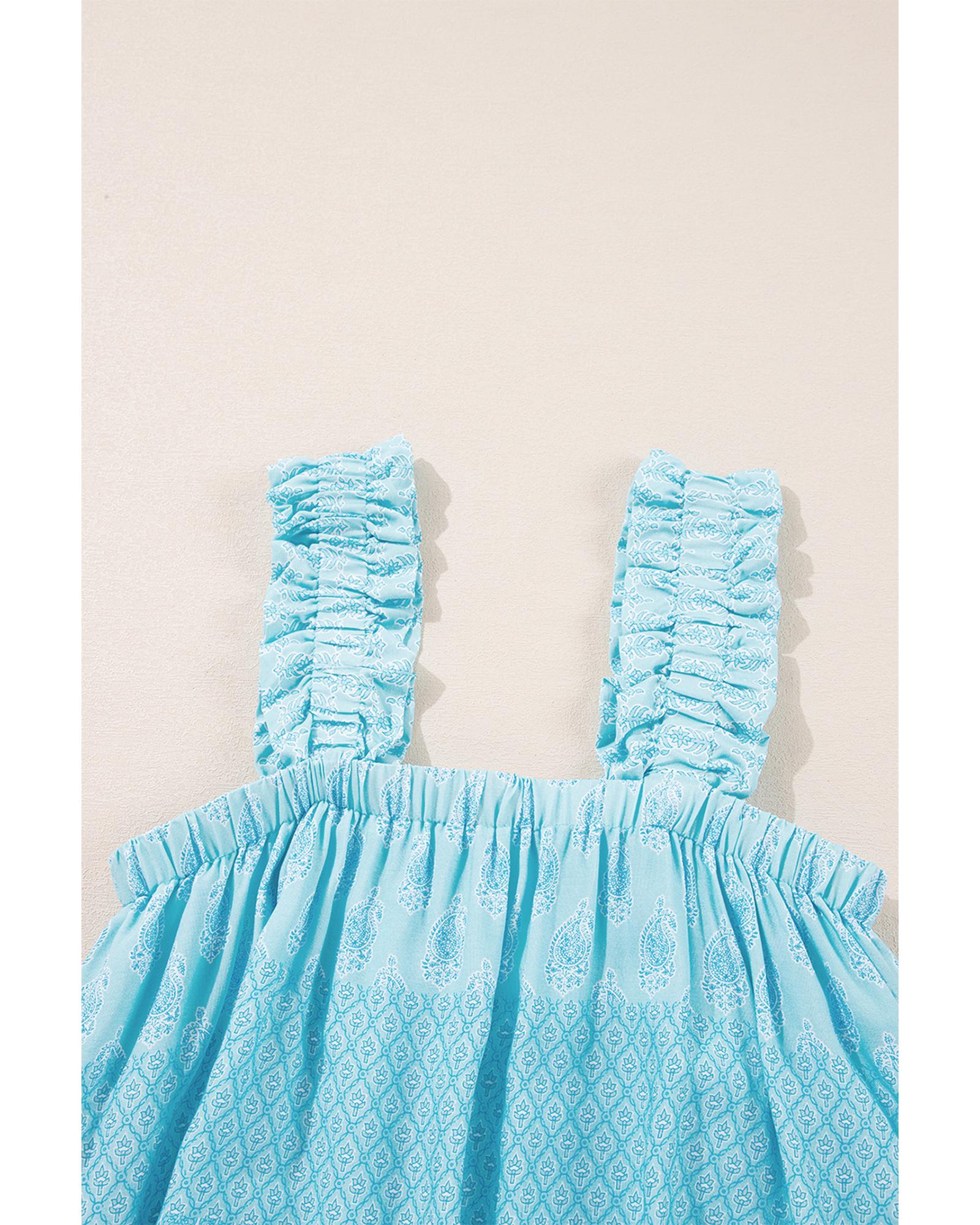 This sky blue tank top features a vibrant tribal pattern print, combined with charming ruffled wide straps that add a feminine touch. Designed with a loose fit, it offers comfort and ease of movement, making it ideal for casual and trendy outfits.