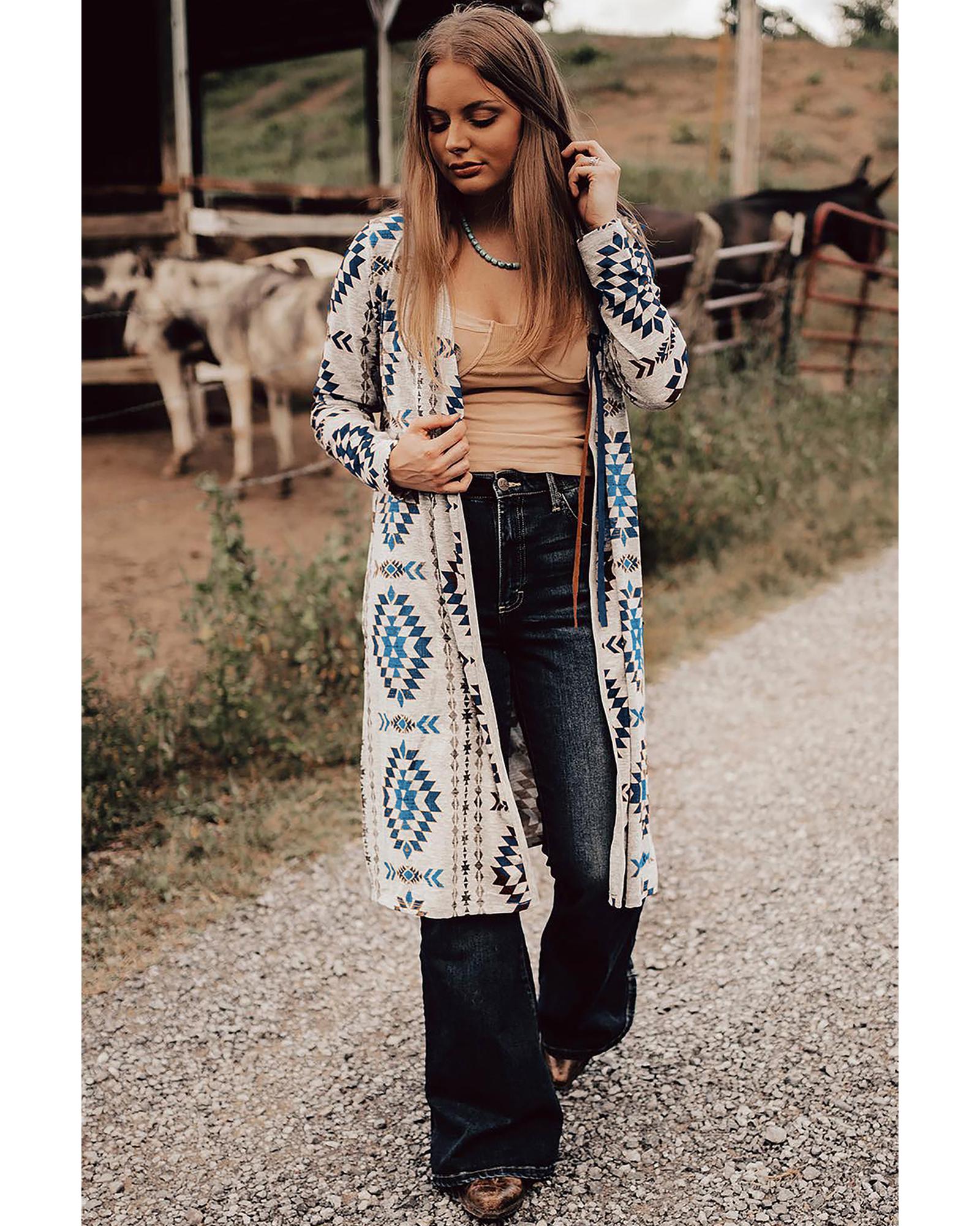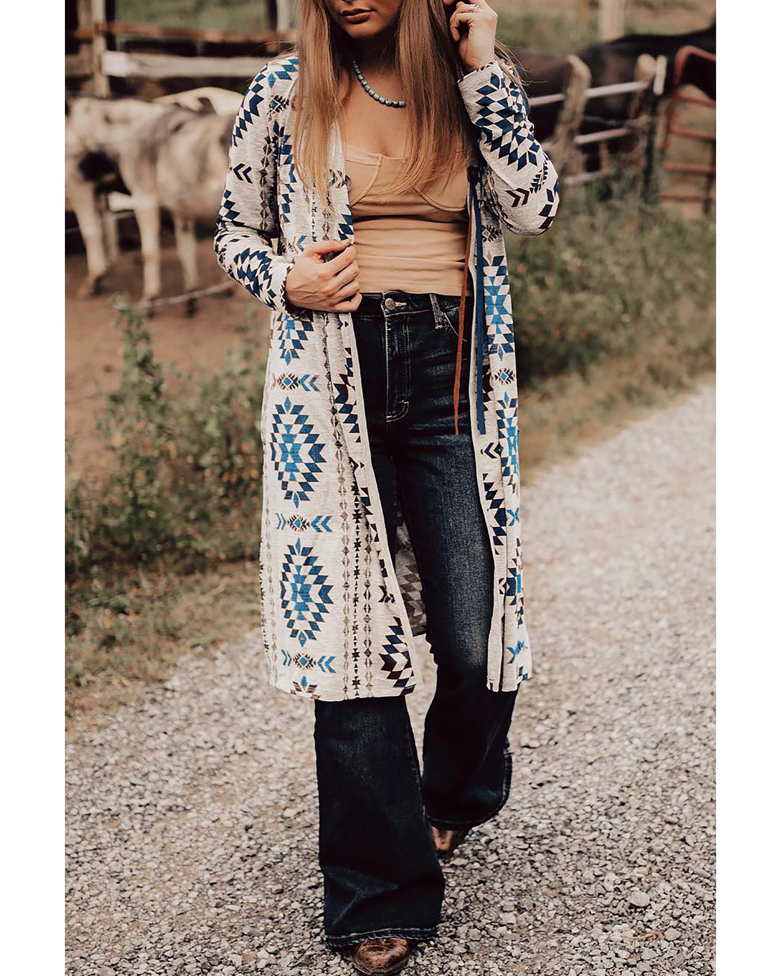 This long cardigan features a stylish Western-inspired Aztec print and an open front design, offering versatile styling options. Its length provides extra coverage and creates a dramatic silhouette, making it suitable for various occasions. Crafted from soft materials, it ensures warmth and comfort for the wearer.