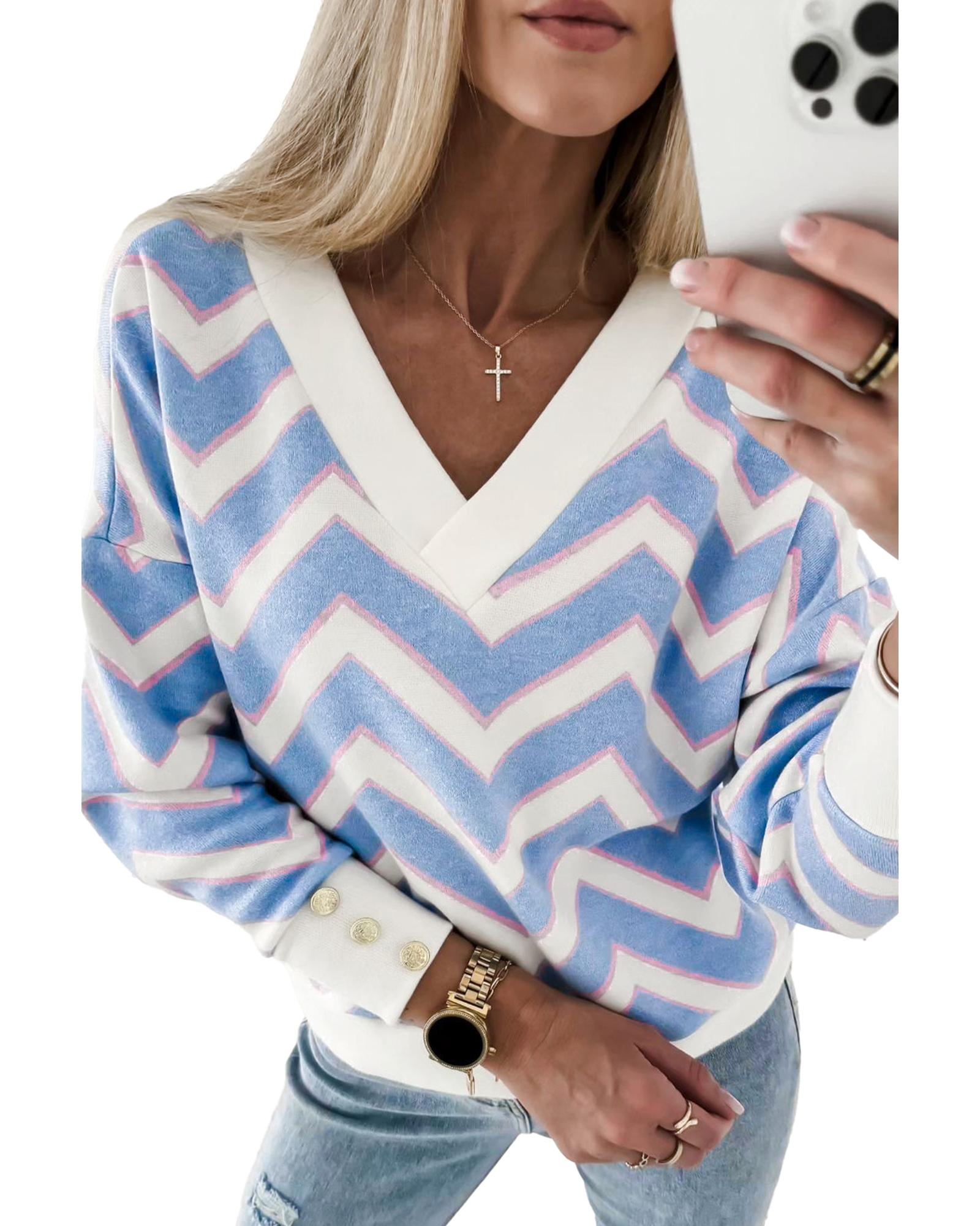 Sky Blue Zigzag Striped Print V Neck Oversized Top – L