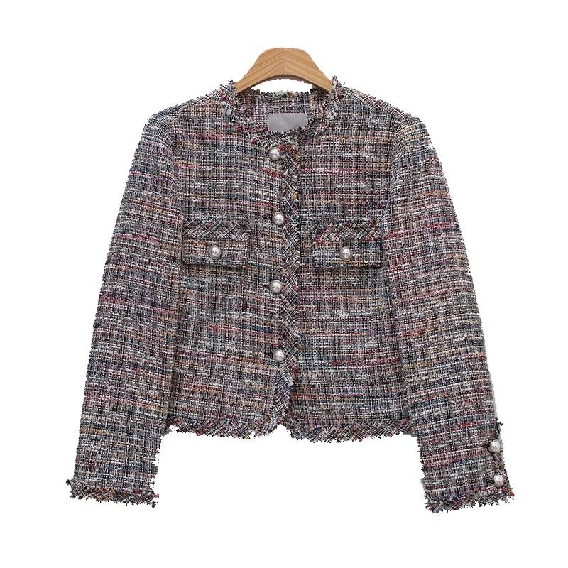 This slim-fit small scented coat offers a sweet and fresh style, perfect for those seeking a fashionable and comfortable outerwear option. It features a long-sleeved design with a T collar, crafted from a blend of viscose and polyester fabrics. The coat showcases a collage/splicing process and has a short length of approximately 40cm, making it suitable for various occasions and styles.