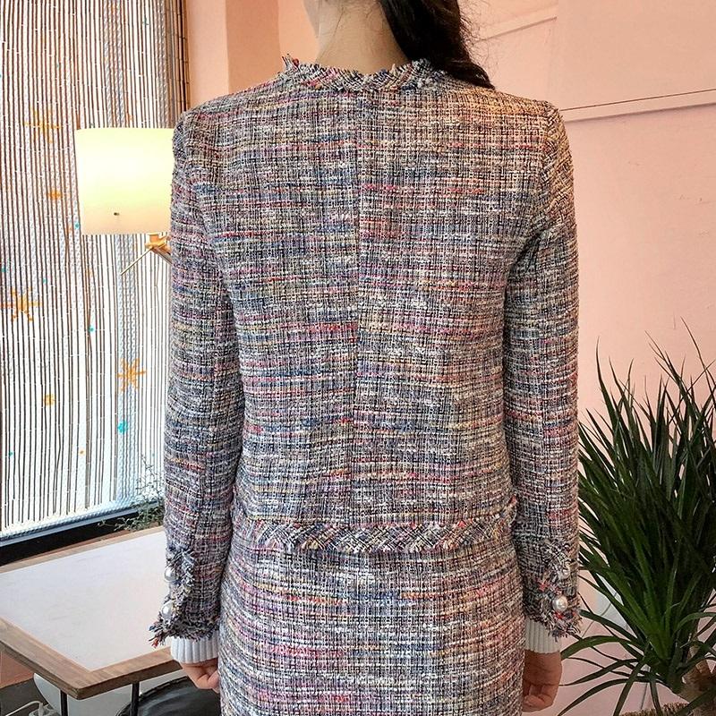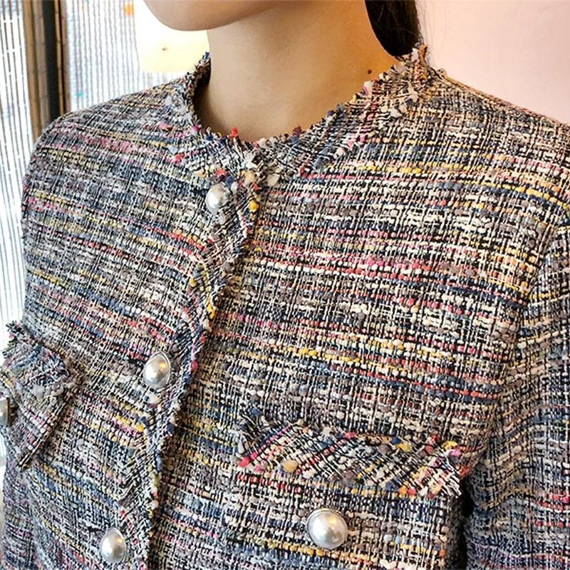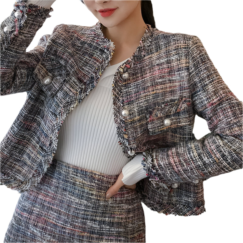 This slim-fit small scented coat offers a sweet and fresh style with a long-sleeved design. Crafted from a blend of viscose and polyester fabric, it features a T collar and a collage/splicing process. The coat has a short length of approximately 40cm, making it suitable for various occasions and styles.