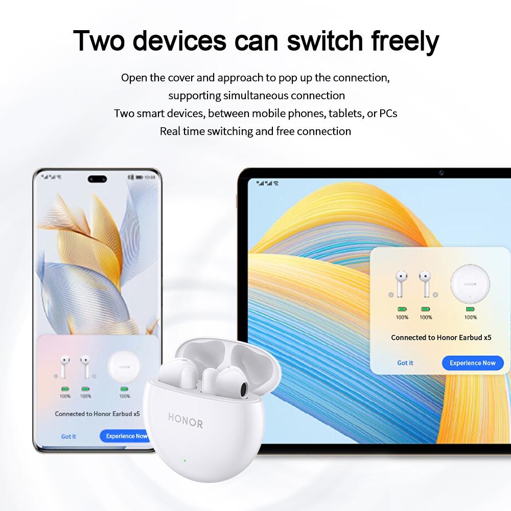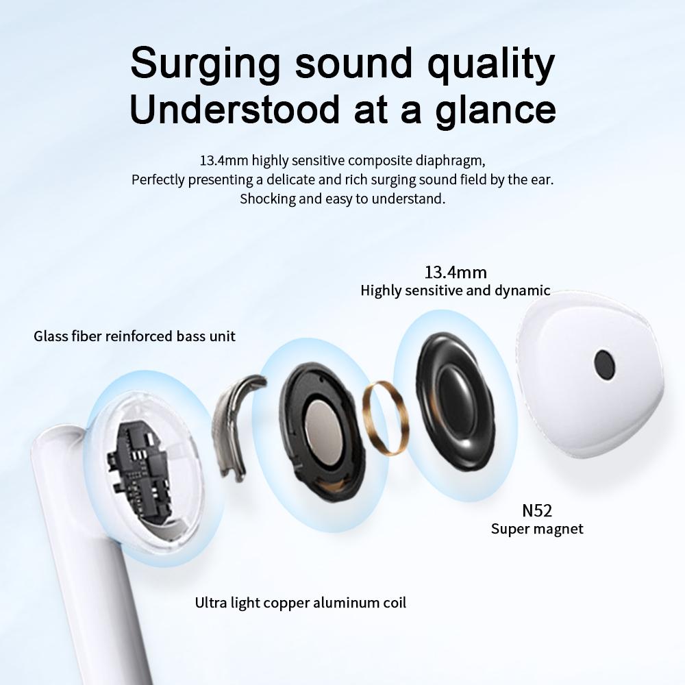 These wireless Bluetooth earbuds feature a semi-in-ear design for comfortable wear and deliver powerful sound with a 13.4mm highly sensitive composite diaphragm. They support connection to two devices simultaneously with easy switching and incorporate intelligent noise reduction for clear communication. The earbuds offer a long battery life of up to 27 hours with low power consumption, making them suitable for extended use.