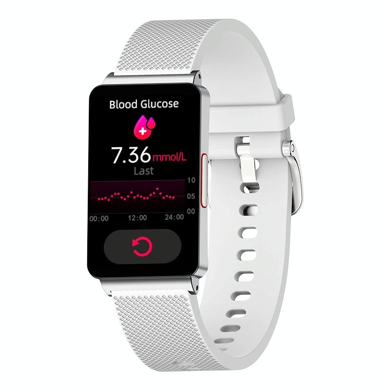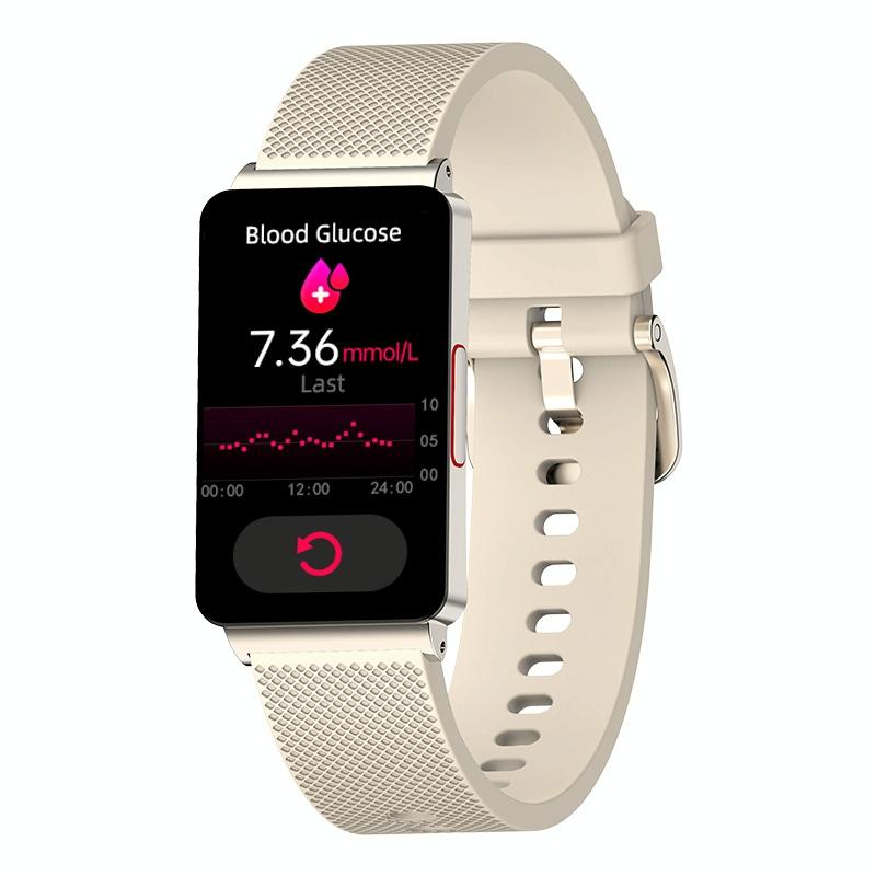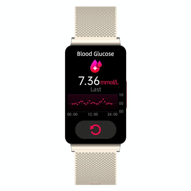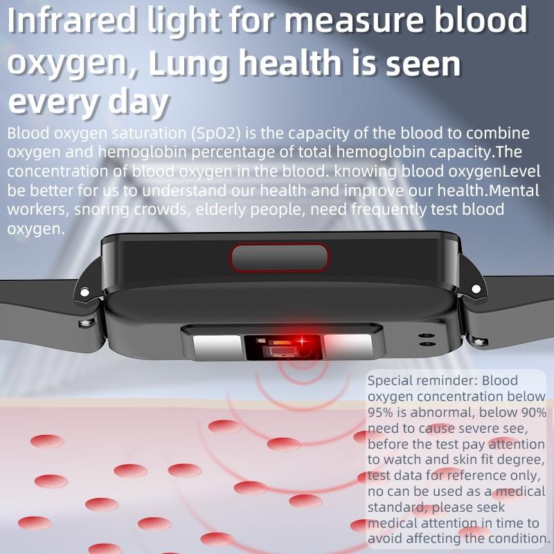 This smart health monitoring watch features a color screen and comprehensive health tracking capabilities. It monitors vital signs such as blood sugar, heart rate, blood pressure, and blood oxygen levels. Additionally, it tracks physical activity including steps, distance traveled, and calories burned. The device also measures sleep duration and quality, supports multiple sport modes, and offers ECG measurement. Users can remotely control the camera and music, and receive notifications for calls and messages.