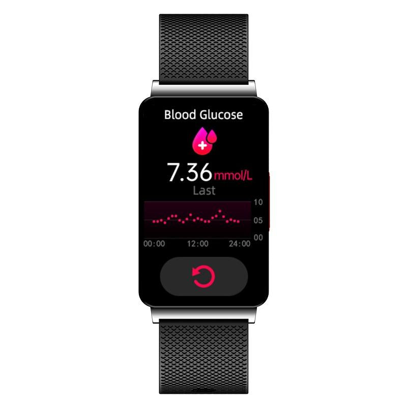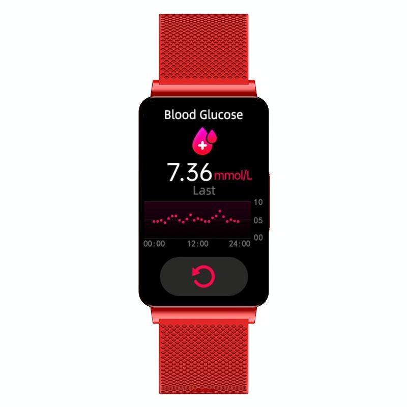 This smart health monitoring watch features a color screen and comprehensive health tracking capabilities. It monitors vital signs such as blood sugar, heart rate, blood pressure, and blood oxygen levels. Additionally, it tracks physical activity including steps, distance traveled, and calories burned. The device also measures sleep duration and quality, supports multiple sport modes, and offers ECG measurement. Users can remotely control the camera and music, and receive notifications for calls and messages.