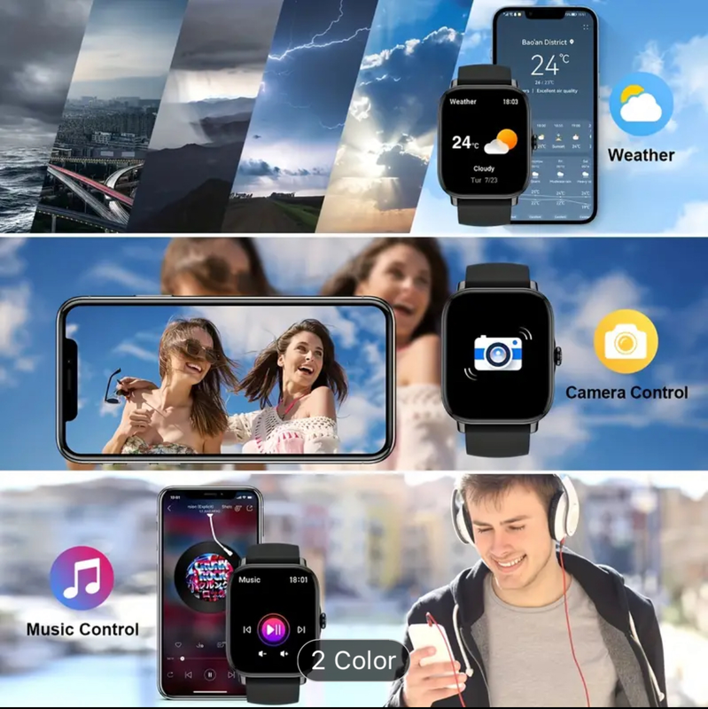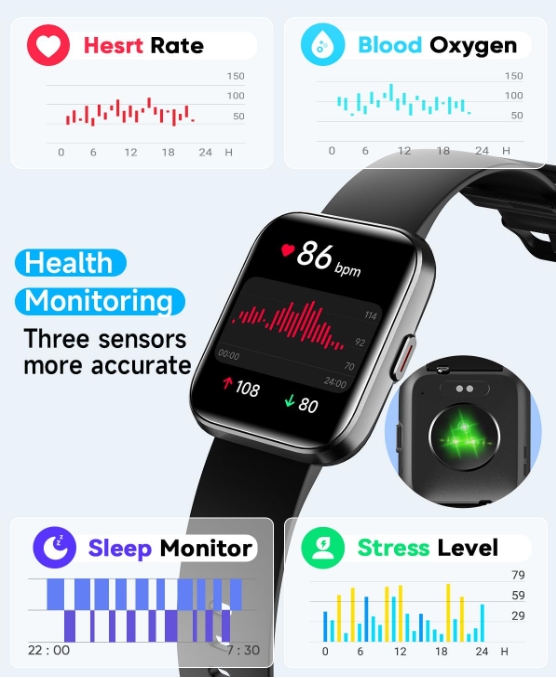 This smartwatch features a 44mm display with Bluetooth call capabilities, health monitoring functions, and various smart notifications. It is compatible with both iOS and Android devices, offering a range of features to support health, fitness, and daily activities.