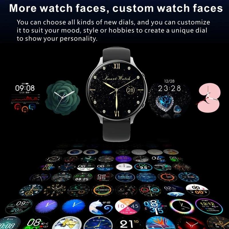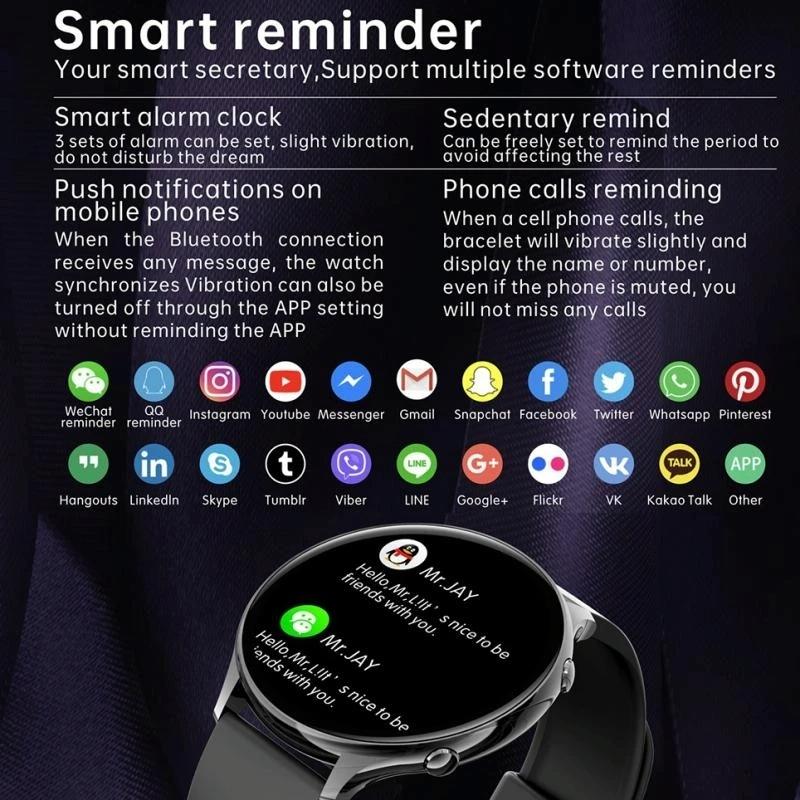 This smartwatch offers comprehensive health and activity monitoring features, including body temperature, heart rate, blood pressure, blood oxygen levels, sleep tracking, and menstrual cycle prediction. It also supports fitness tracking, social notifications, camera and music control, and reminders to stay active. Designed with an IP67 waterproof rating, it is suitable for daily use and various sports activities.