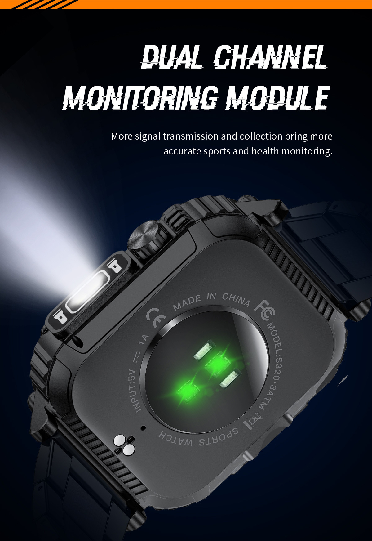 This rugged smartwatch combines health monitoring, outdoor navigation, and convenient communication features in a durable design. It offers comprehensive fitness tracking, a built-in flashlight, and a compass, making it suitable for active and outdoor lifestyles. The device supports wireless calling, customizable watch faces, and provides notifications for enhanced daily use.