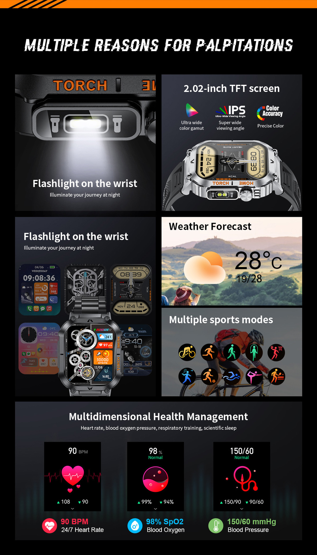 - Functions: Heart rate monitor, blood oxygen monitor, wireless calling, pedometer, calorie counter, distance tracker, sleep monitor, flashlight, compass, notifications, customizable watch faces