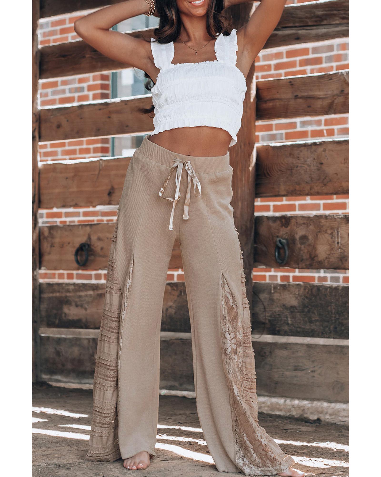 This pair of wide-leg high waist pants features a stylish smoke gray boho lace patchwork design, combining elegance with comfort. The high waistline offers a flattering silhouette, while the wide leg cut ensures a relaxed and chic look suitable for daily wear. Crafted from breathable materials, these pants are ideal for all-day comfort.