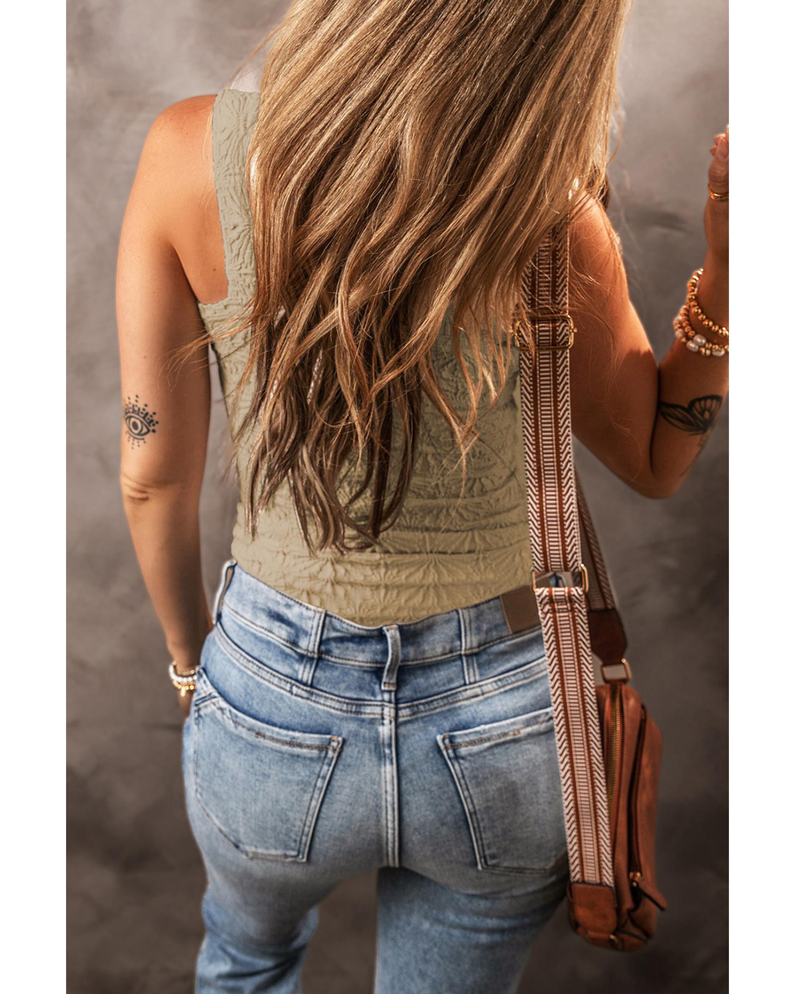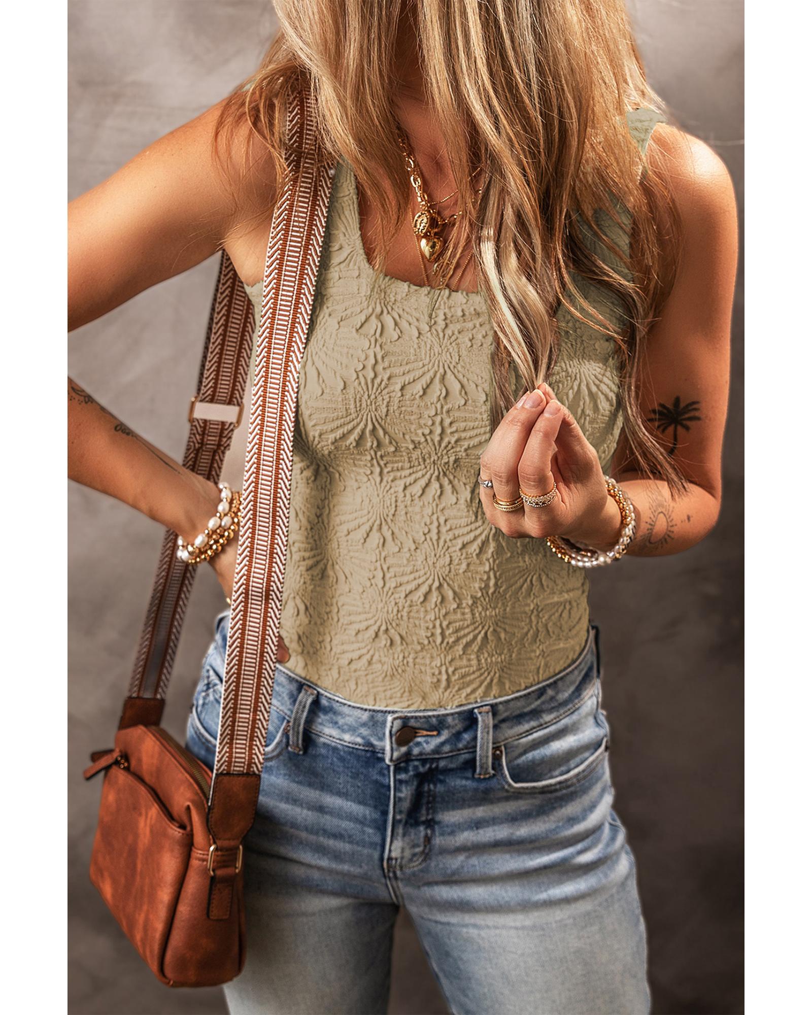 This Smoke Gray Floral Jacquard Square Neck Tank Top combines elegance and versatility, making it a stylish addition to any wardrobe. Designed with a trendy fitted silhouette, it is suitable for layering or wearing alone, offering both comfort and sophistication for everyday wear.