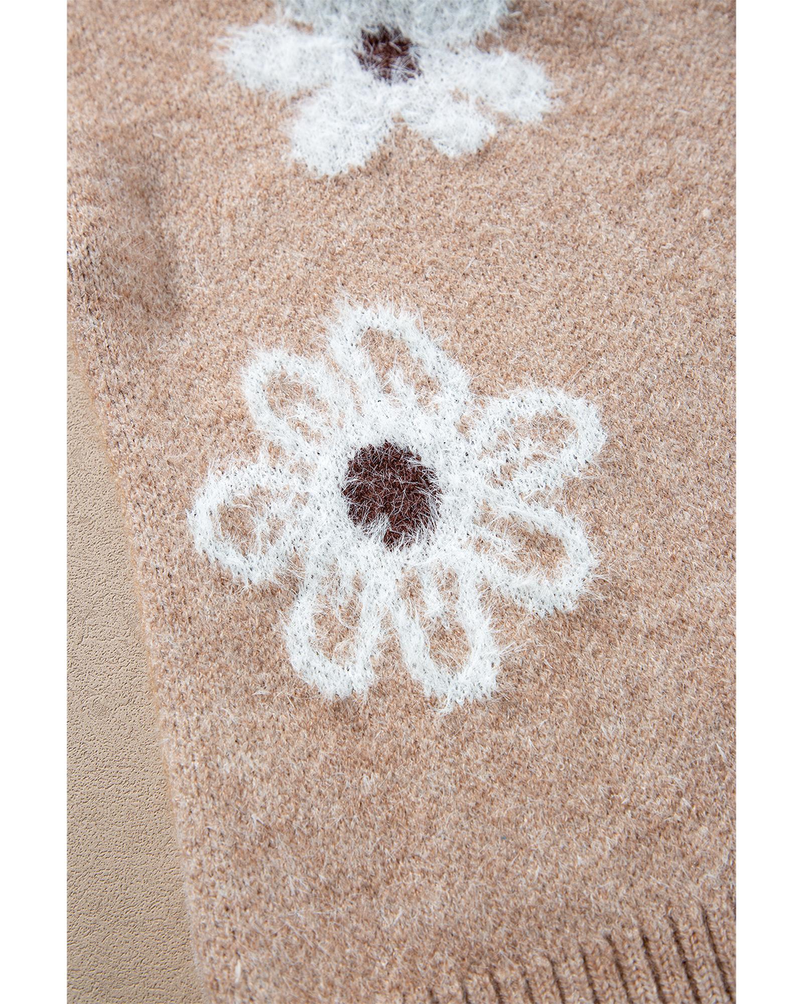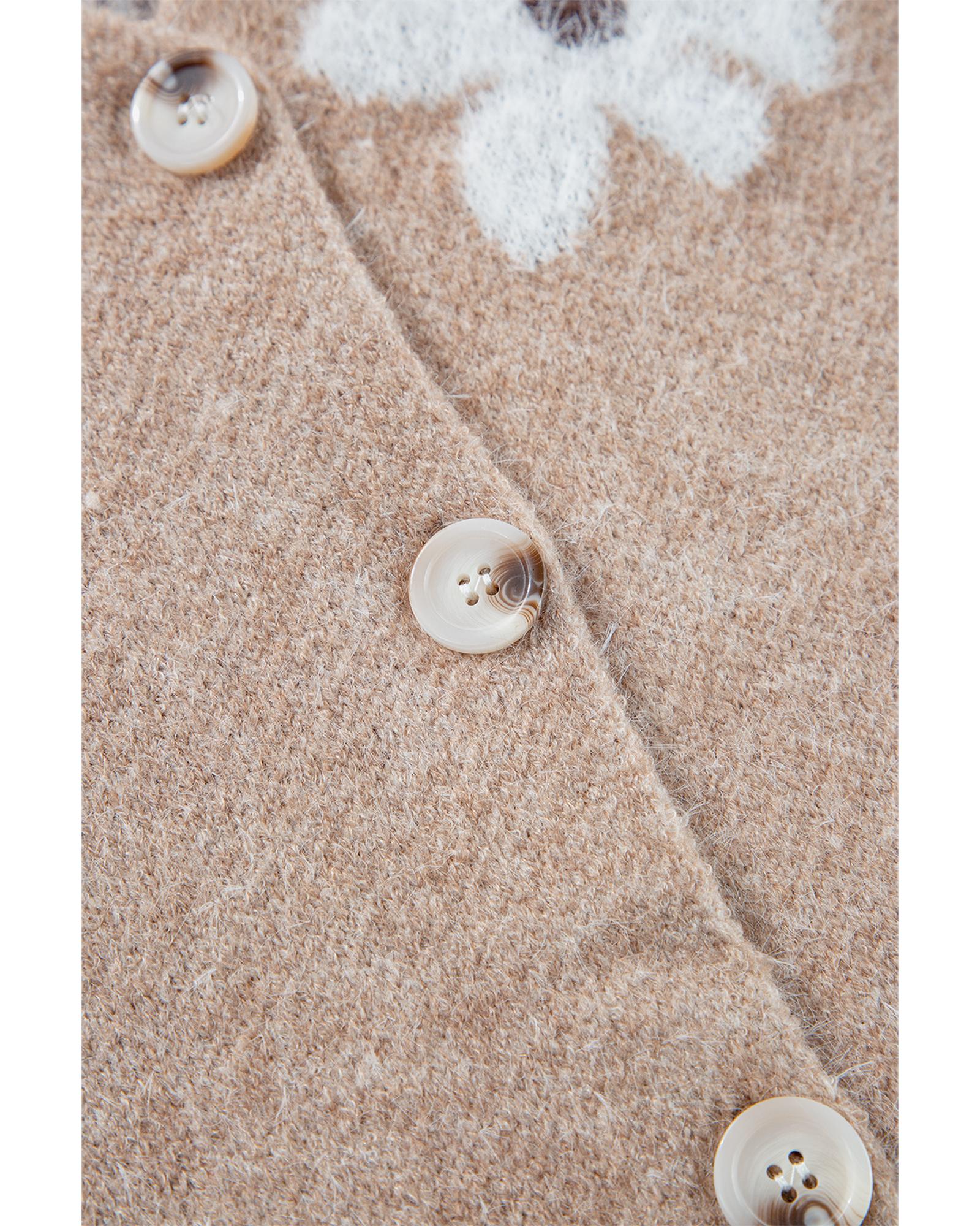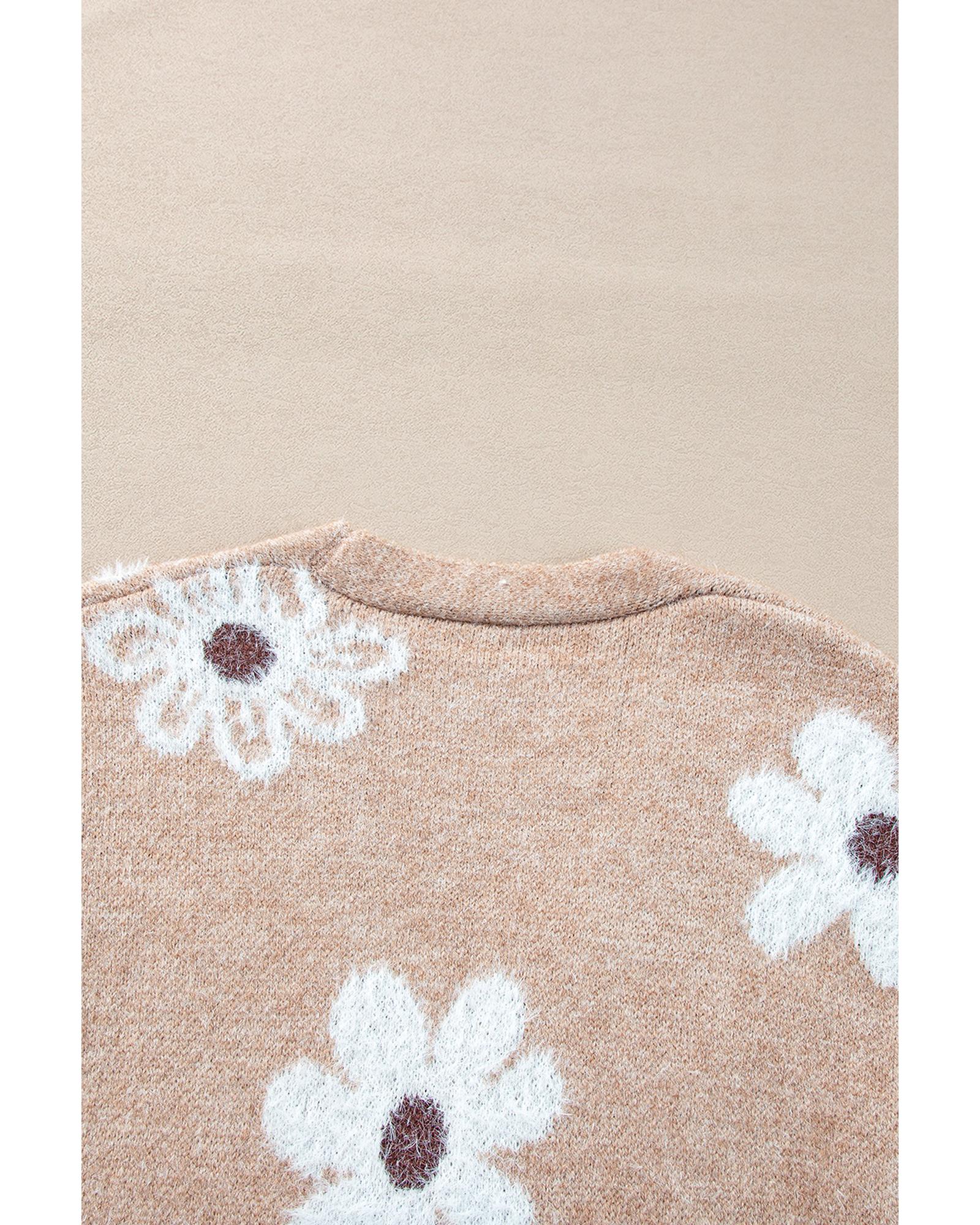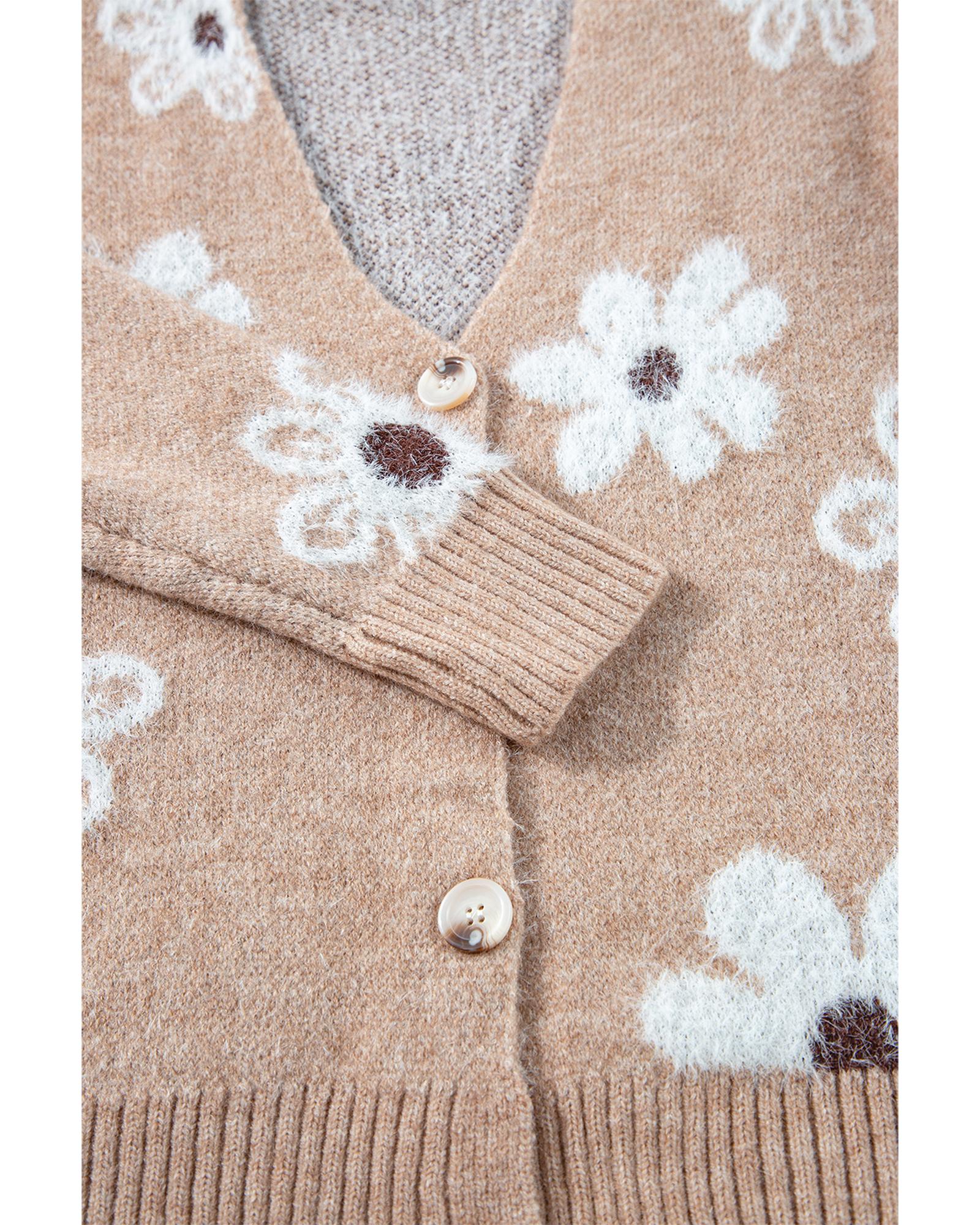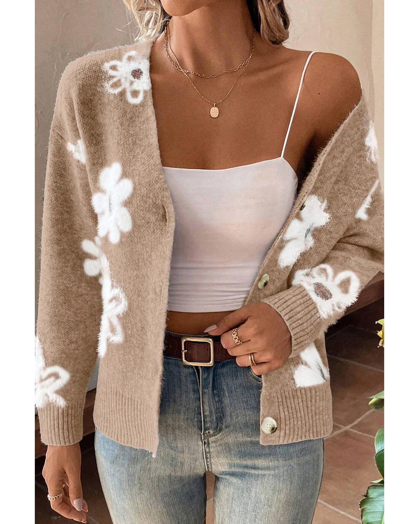 This cardigan features a stylish floral print in a smoke gray color, designed with a flattering V-neckline and long sleeves. It offers a versatile button-up closure, combining elegance with comfort, making it suitable for various occasions.