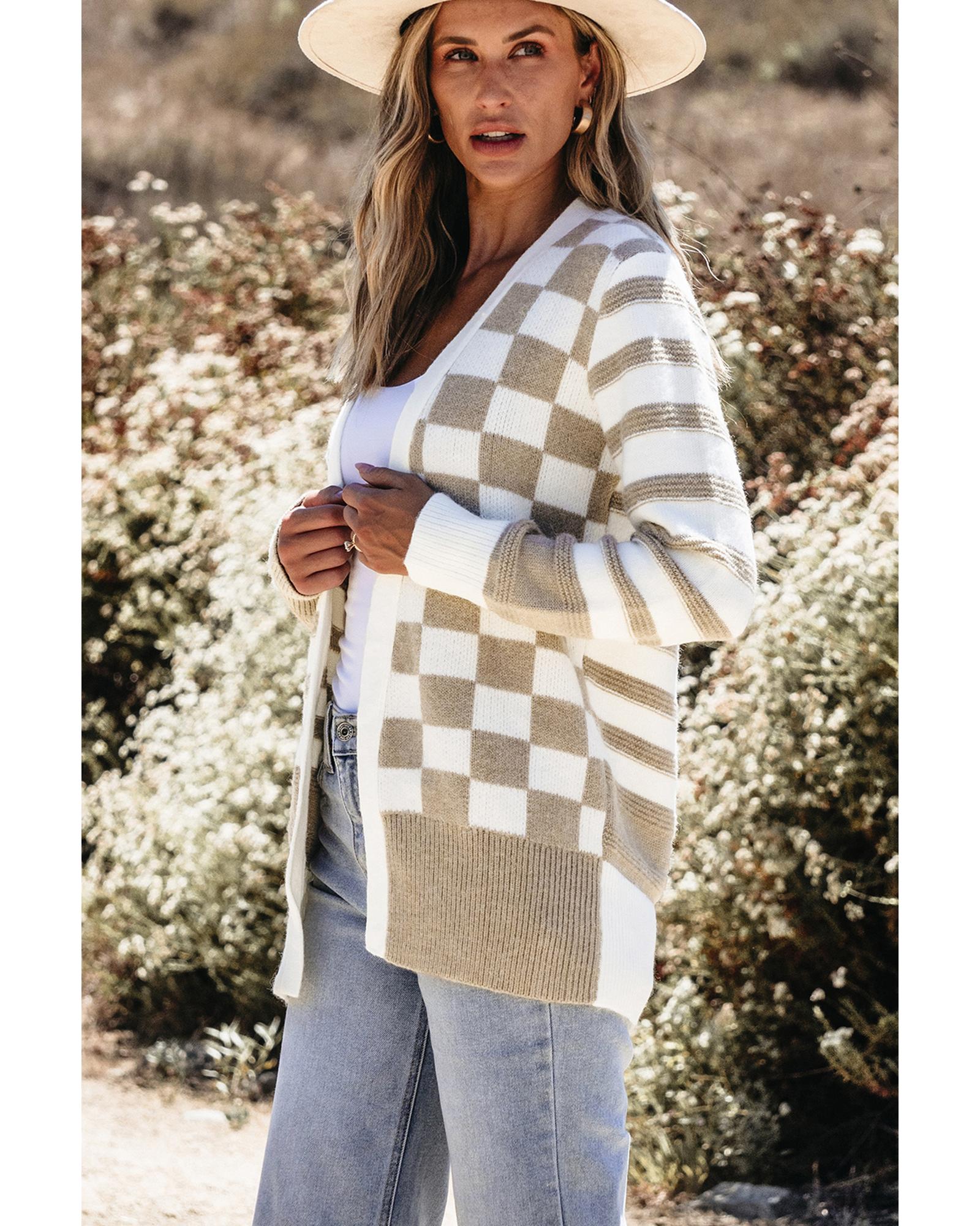 This smoke gray gingham striped knitted open front cardigan offers a stylish and comfortable layering option. Its timeless pattern and cozy fit make it suitable for transitional seasons and versatile outfits.