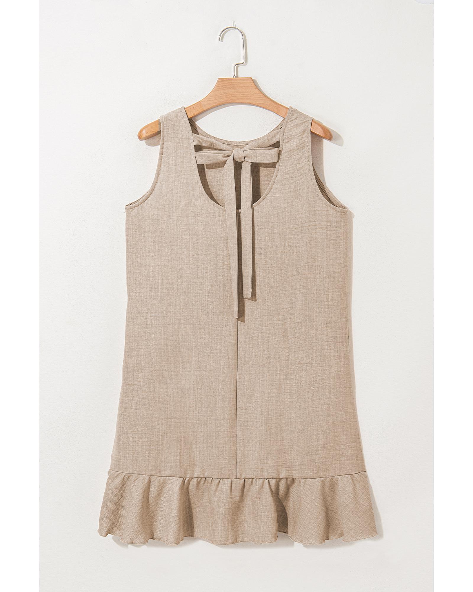 This sleeveless mini dress features a stylish knot back design and a ruffle hem, creating a flirty and fashionable look. The solid smoke gray color makes it versatile for various occasions, while the sleeveless cut highlights the shoulders and arms for a chic appearance.