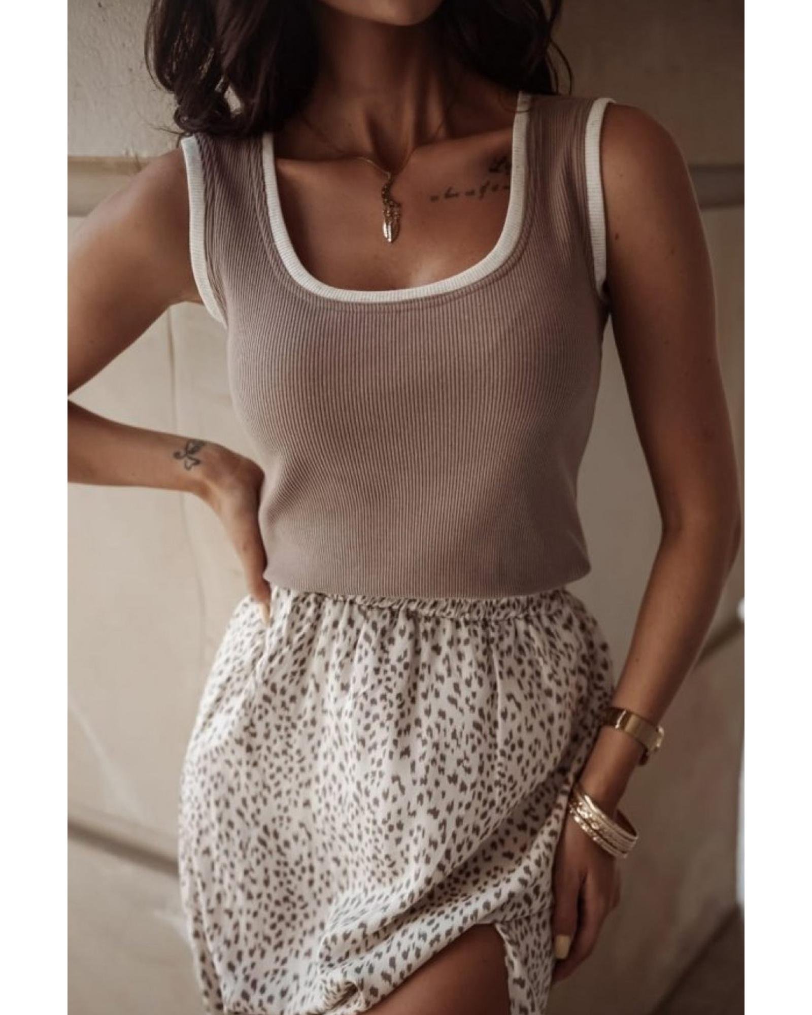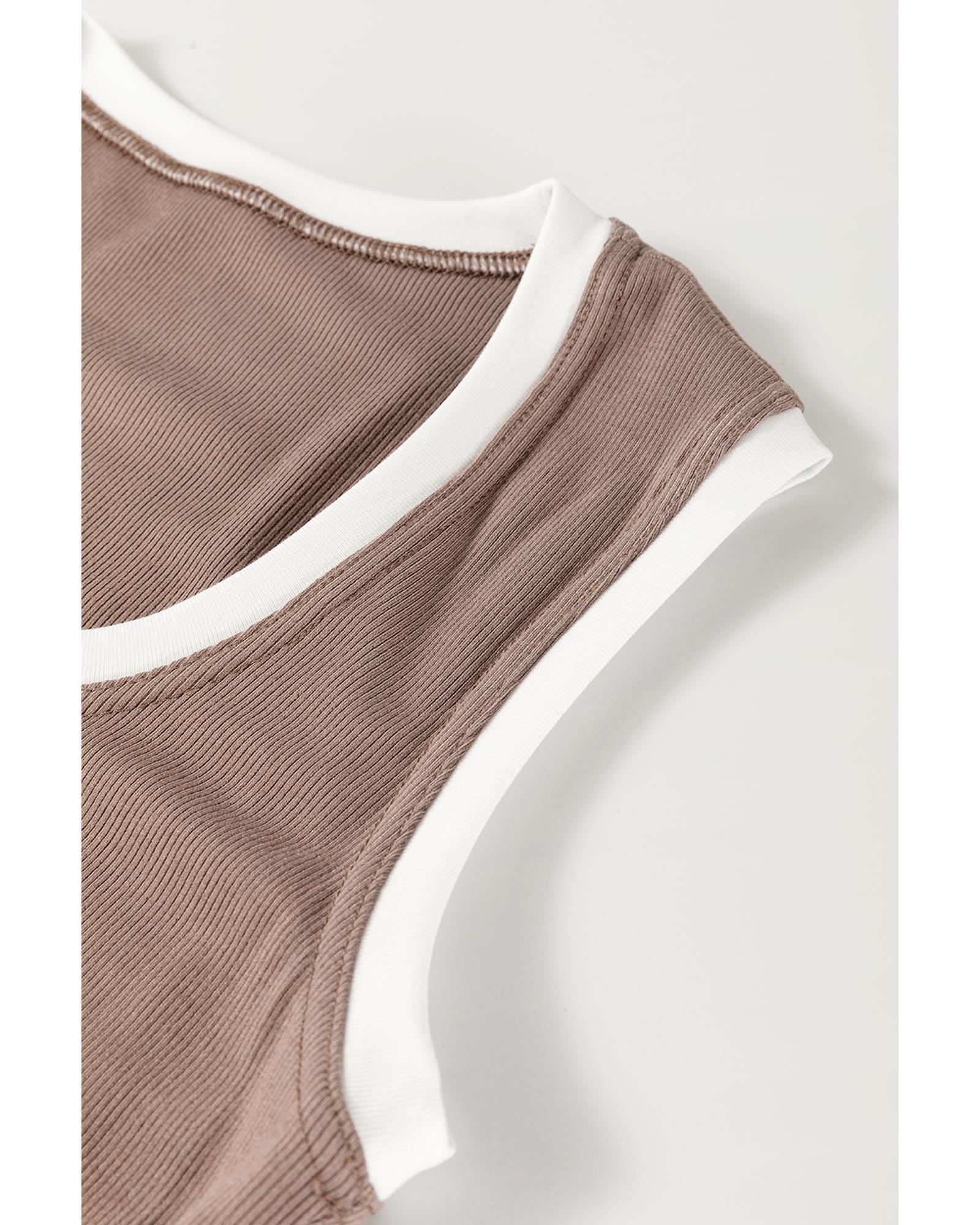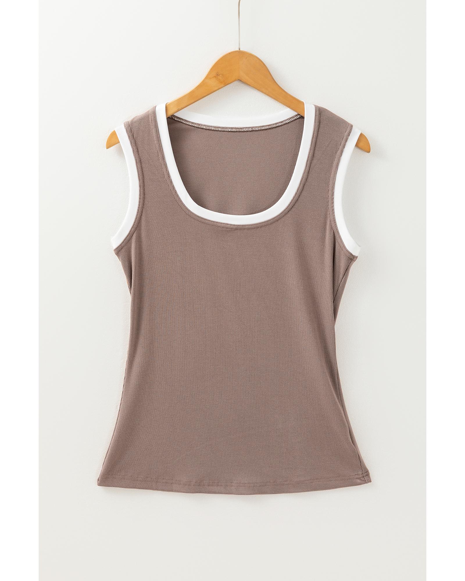 This Smoke Gray Ribbed Knit Colorblock Edge U Neck Slim Fit Tank Top offers a modern and stylish look with its colorblock design and slim fit silhouette. Crafted from a comfortable ribbed knit fabric, it is suitable for layering or wearing alone for various occasions.