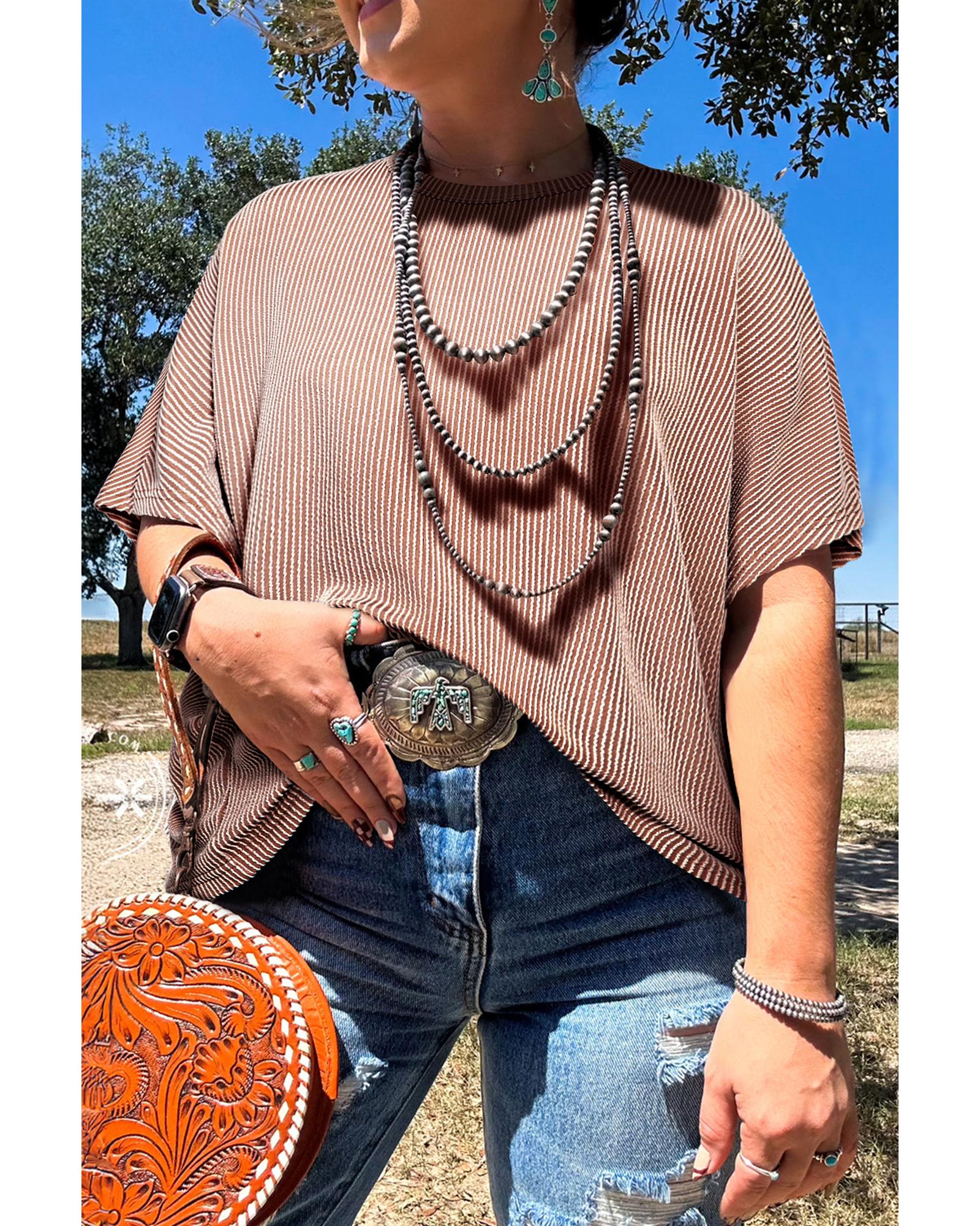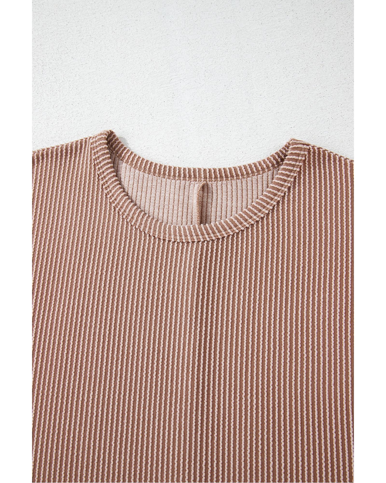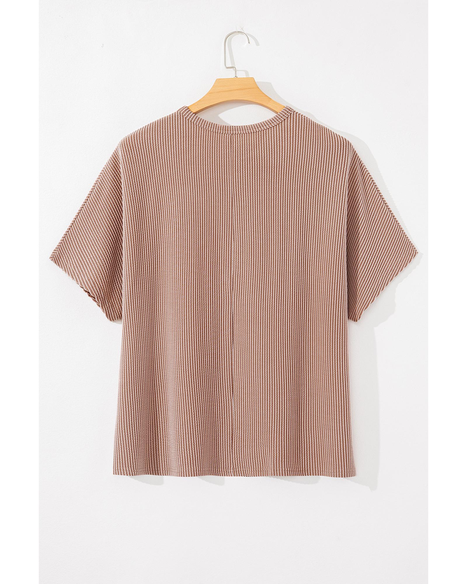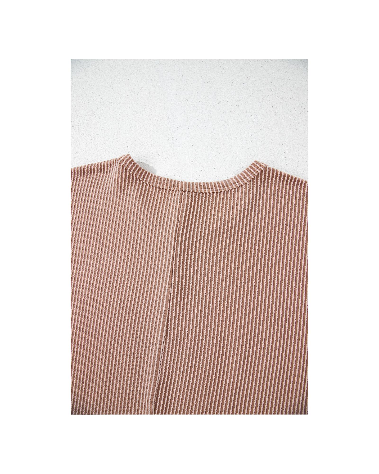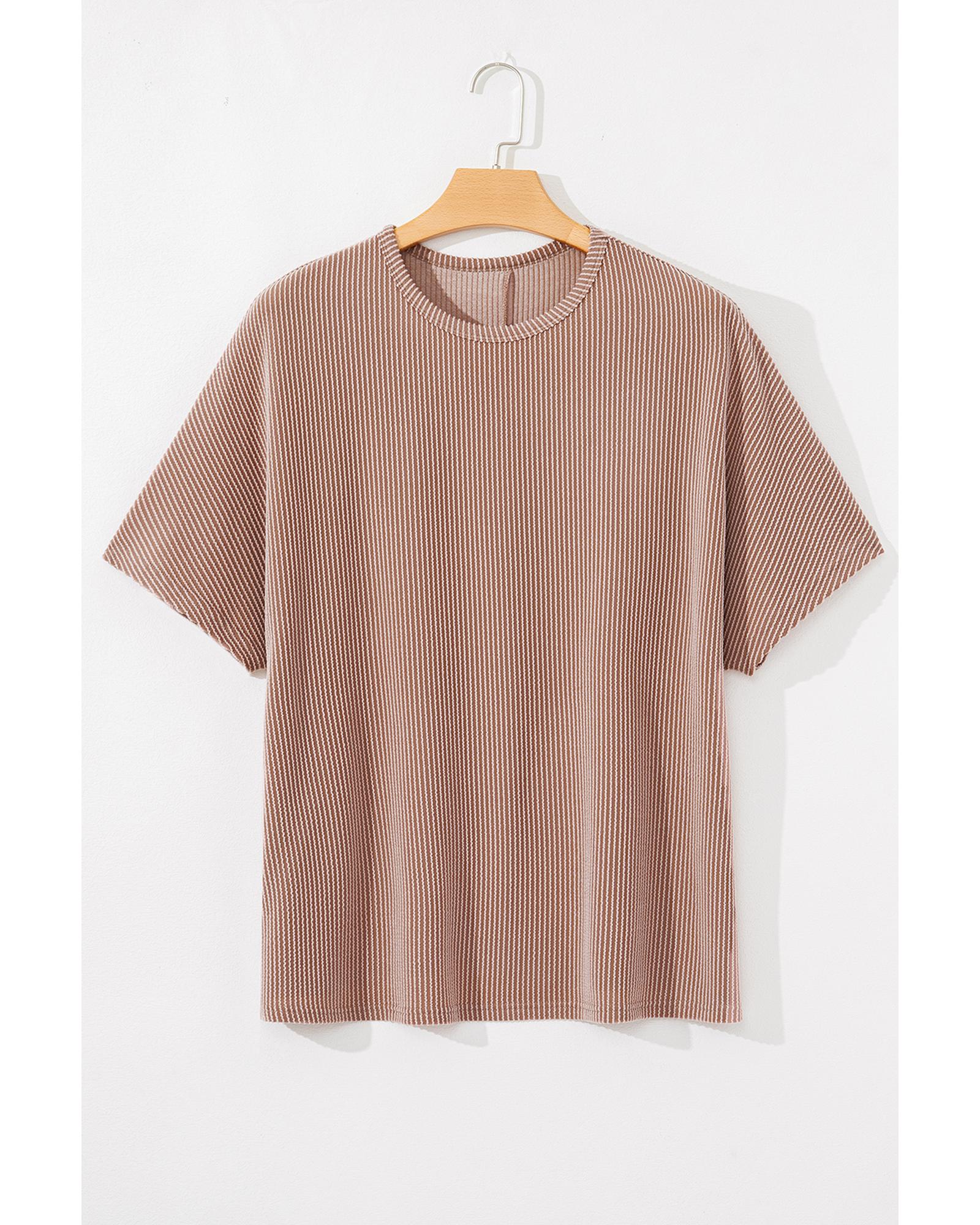 This plus size knit T-shirt features a stylish ribbed texture and a classic striped pattern, offering a versatile and timeless look. Designed with a crew neck and a trendy fitted silhouette, it is suitable for women seeking a comfortable yet fashionable option.