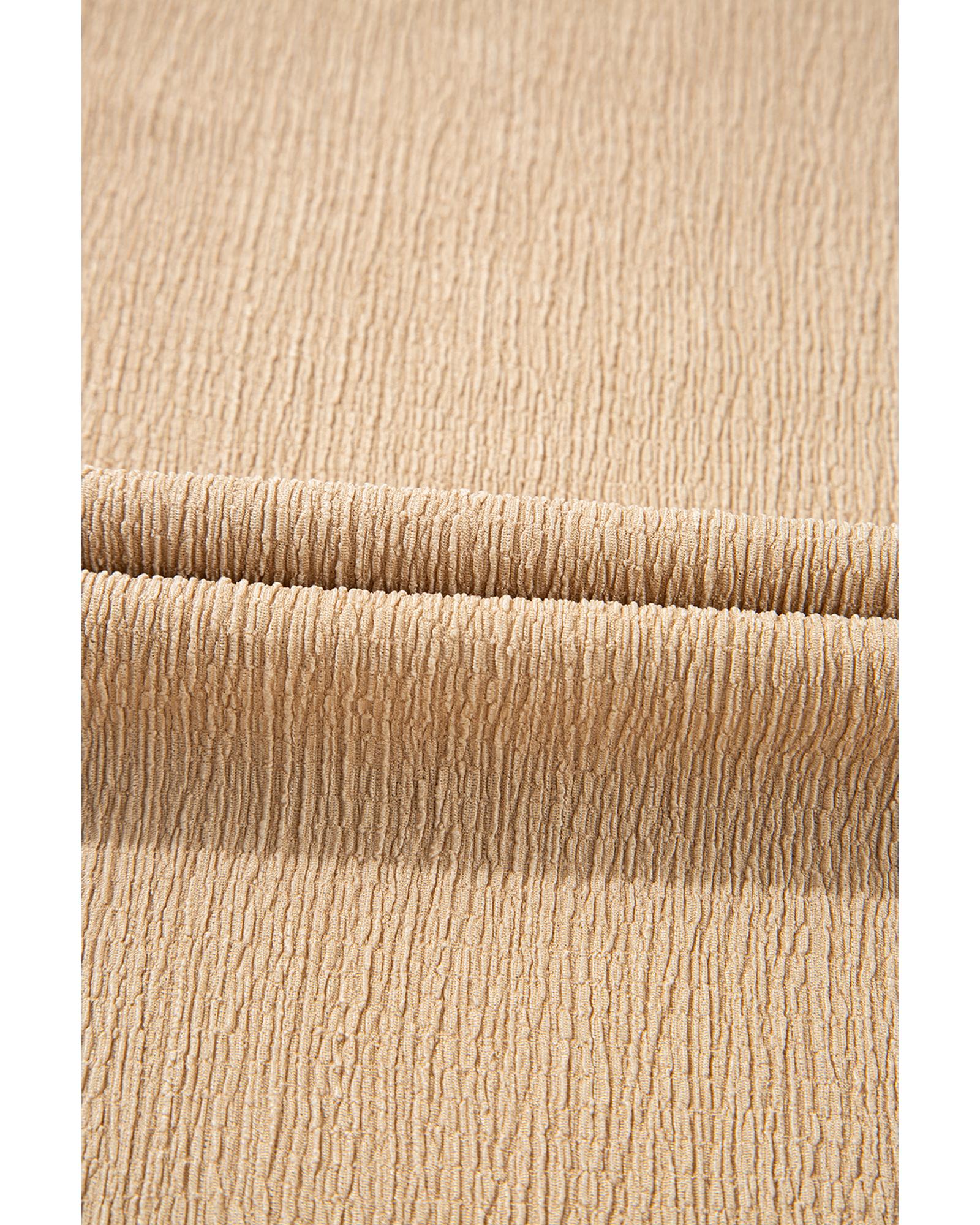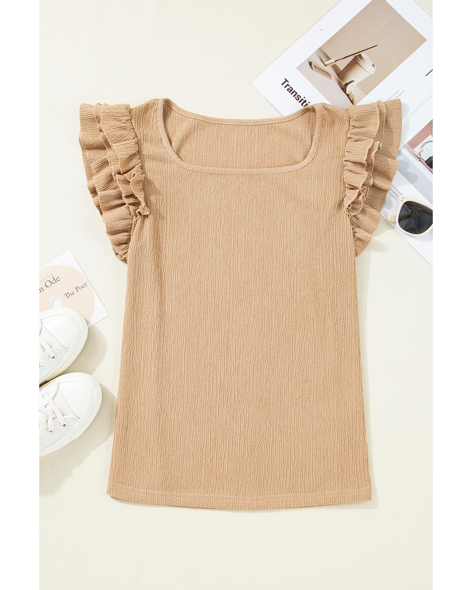 This textured top features a stylish square neckline and ruffled tiered sleeves, offering a trendy and flattering fit. Its lightweight and stretchy silhouette makes it versatile and easy to pair with various outfits, perfect for a fashionable look.