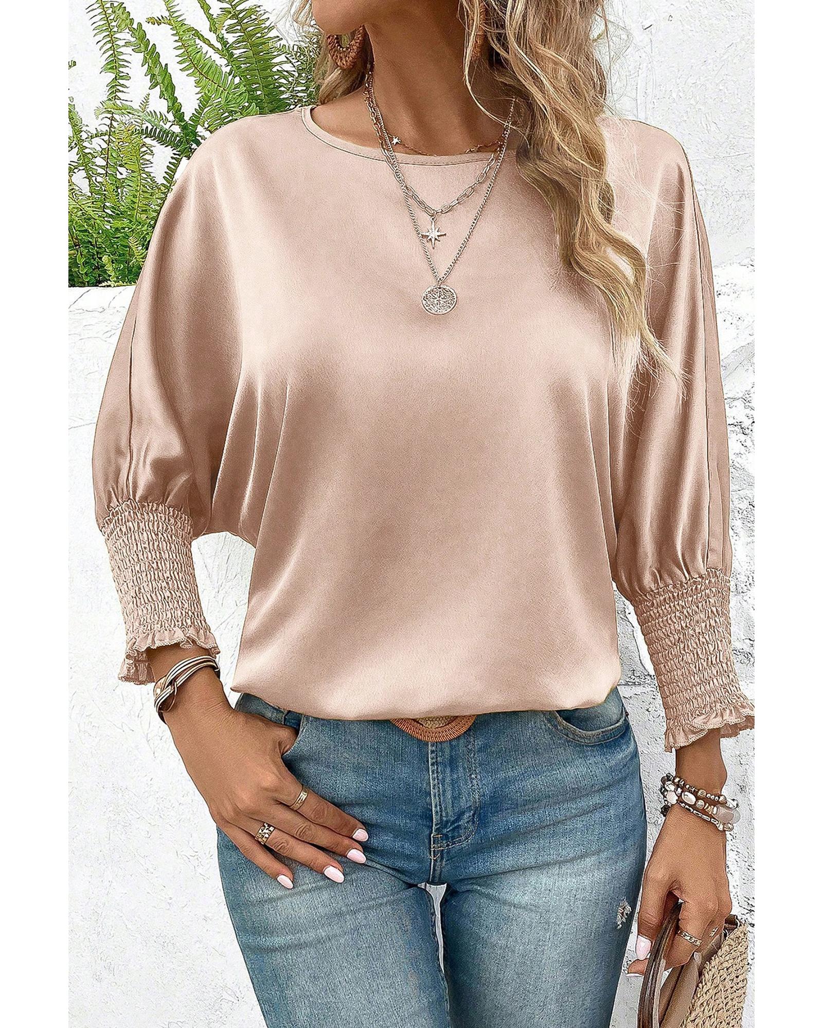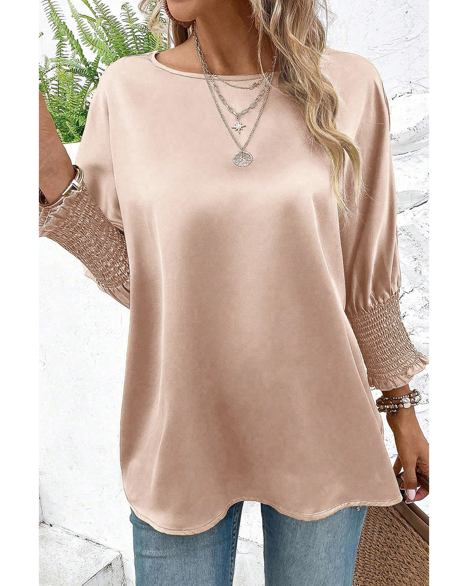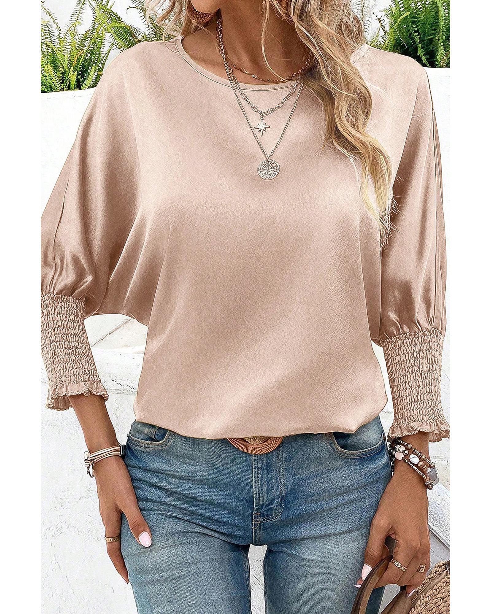 This satin blouse features a stylish smoke gray color with shirred detailing and dolman sleeves, offering a versatile and luxurious look suitable for various occasions. Designed with a trendy fitted silhouette, it provides a comfortable yet fashionable fit that complements different styles.