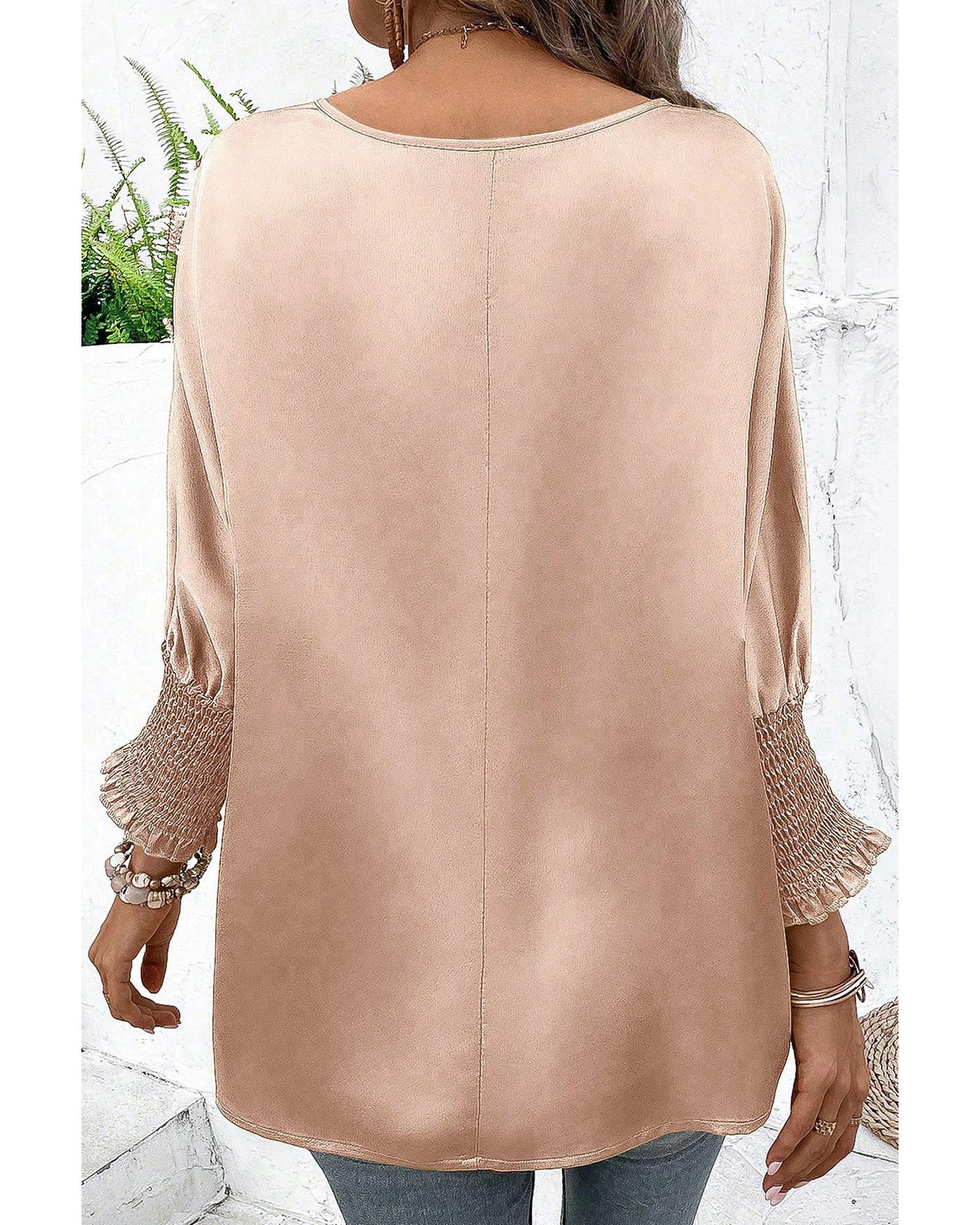 This satin blouse features a stylish smoke gray color with elegant shirred detailing and dolman sleeves. Designed for a trendy fitted look, it offers a versatile and luxurious appearance suitable for various occasions. The blouse is unisex and crafted from smooth satin material, providing both comfort and style.