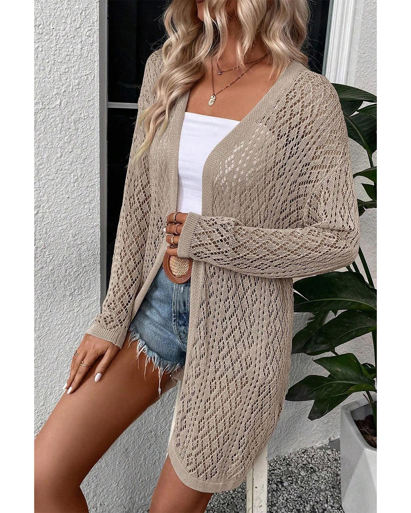 This Smoke Gray Solid Color Pointelle Knit Open Front Cardigan offers a versatile and stylish layering option suitable for various occasions. Its trendy fitted design and tunic length create a flattering silhouette, making it a great addition to your wardrobe.