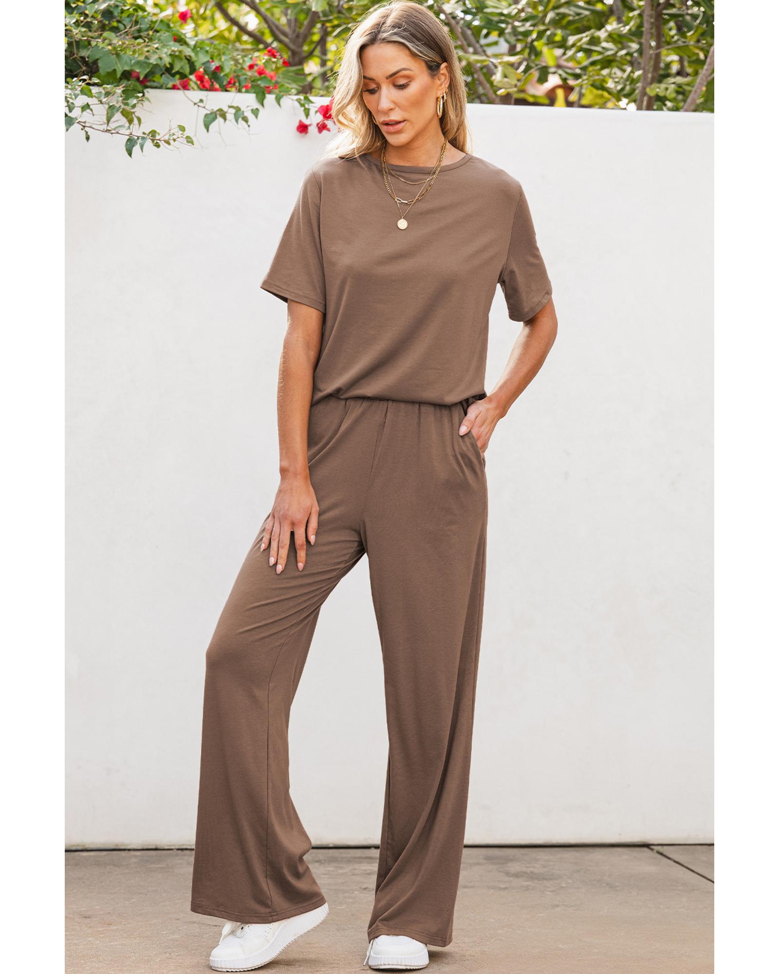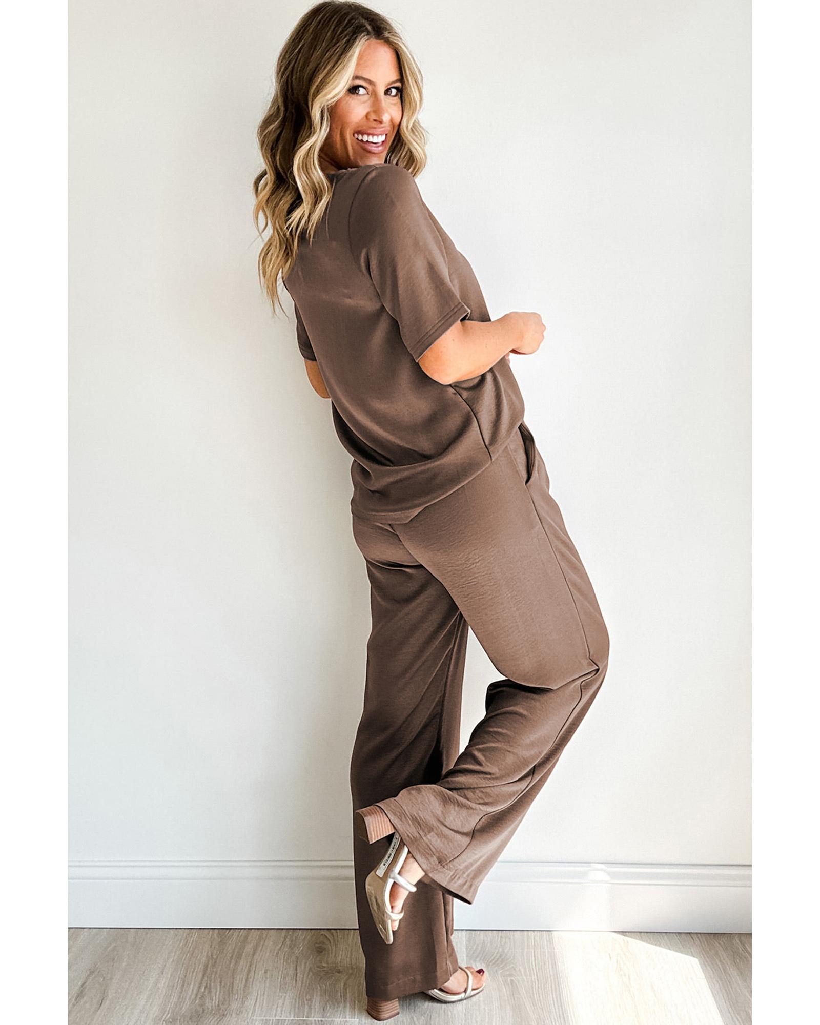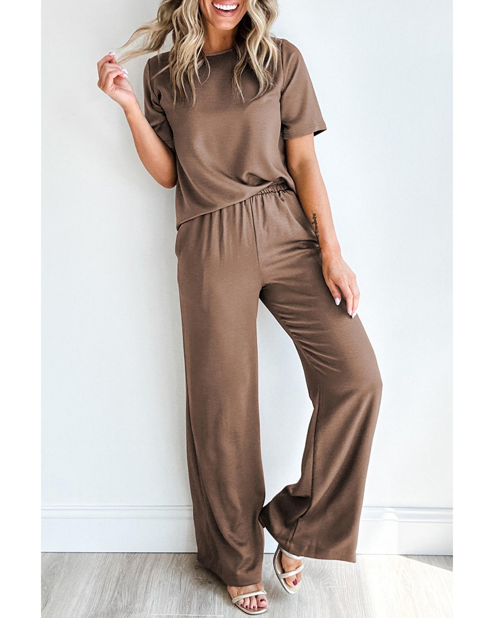 This set includes a solid color T-shirt and wide-leg pants, designed for a trendy and comfortable fit. Made from skin-friendly fabrics, it offers a versatile style suitable for various casual occasions. The outfit can be paired easily with sandals, sneakers, or flats for a chic look.