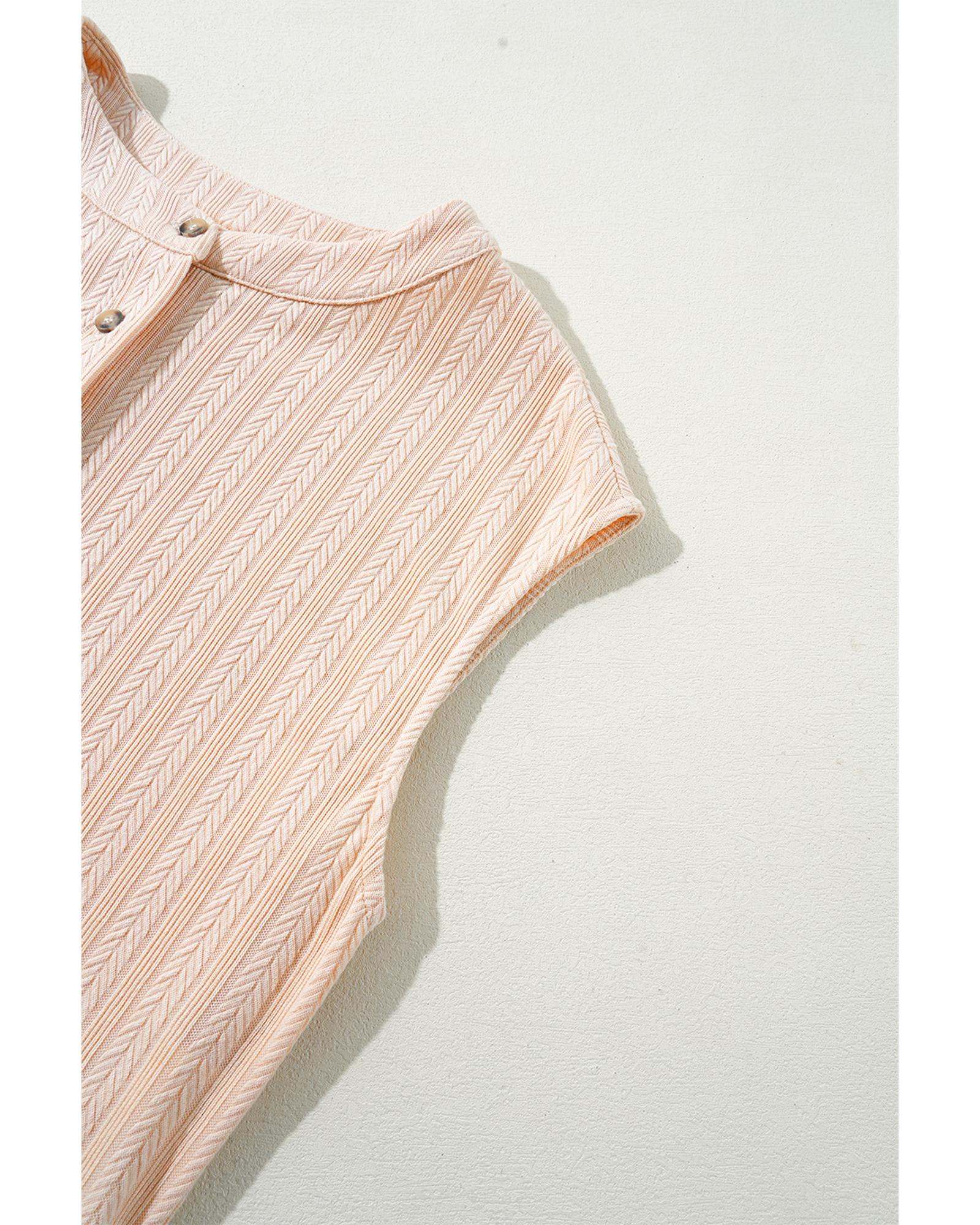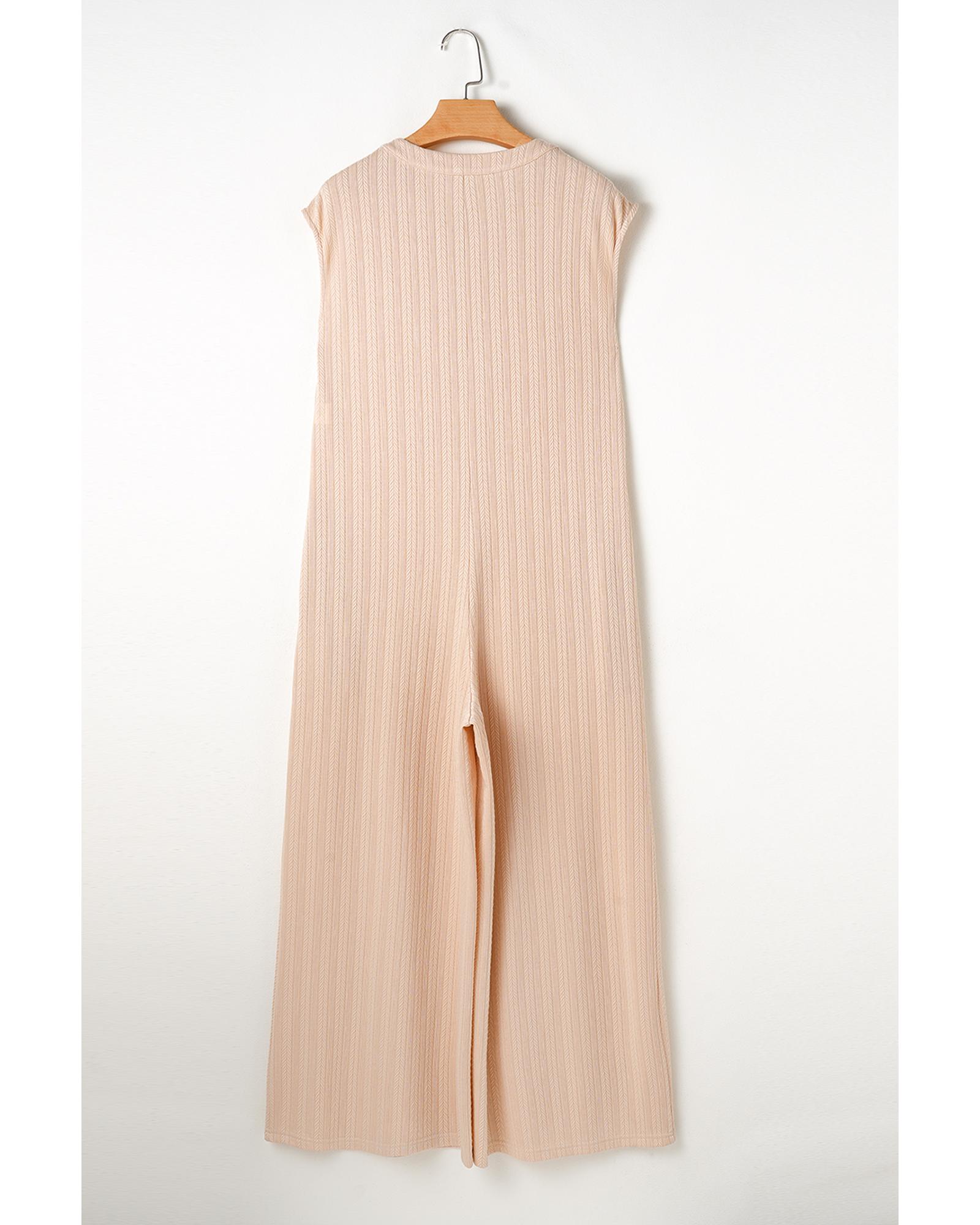 This stylish jumpsuit features a textured fabric with a sophisticated buttoned front design. Its wide leg cut offers a flattering silhouette, while the sleeveless style provides comfort and a modern look. Perfect for various occasions, this piece combines fashion and versatility.