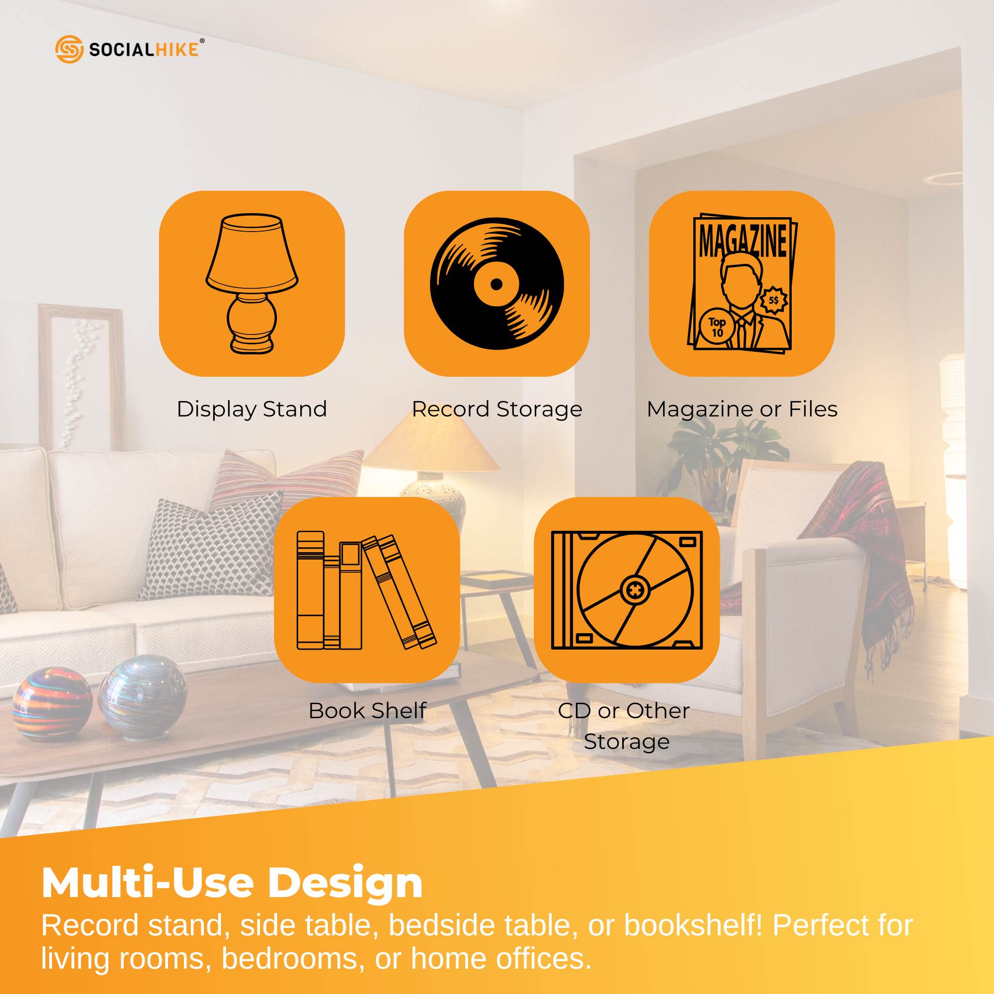 - Multi-purpose design allows it to function as a record stand, side table, bedside table, or bookshelf.